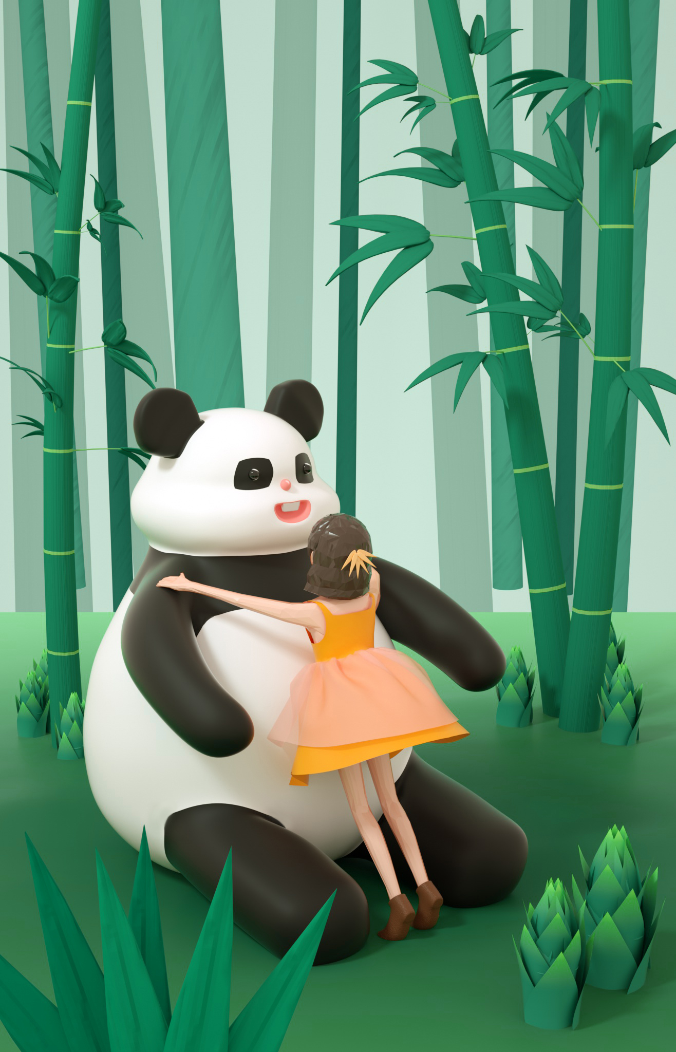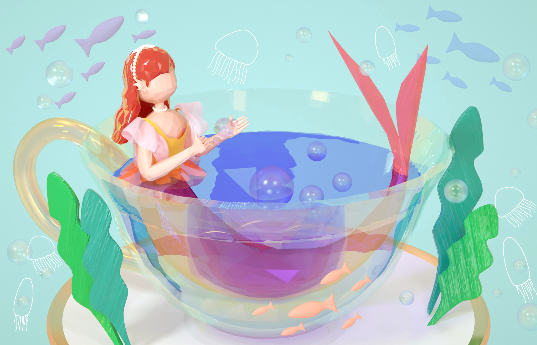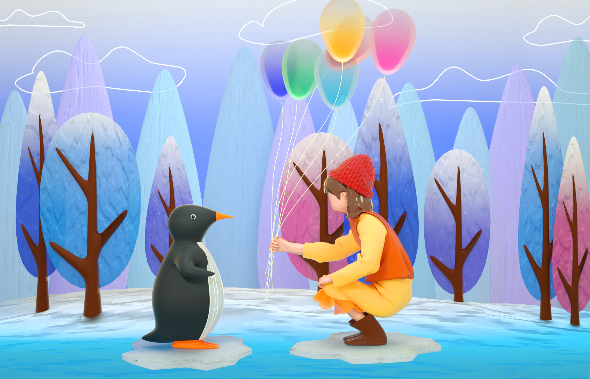 设计说明:这一组三维插画的设计灵感来源于一次奇妙的梦境。梦中的场景十分贴近生活,明明是常常发生的场景,却又显得有些陌生。因为近期疫情的影响,人们不得不待在家里避免外出,我们和外界的事物隔开了一段距离,我也同样如此,每天都是过着枯燥的生活。这场梦境让我不禁想起了所期盼的那些美好。她站在自己的星星上眺望浩瀚无垠的宇宙,思考着渺小的自己存在于此间的意义。她伴着飘舞的花瓣,脚尖轻点在花间旋转,坐在橘子摩天轮上呼喊。白色的奶油蛋糕做的小床和装满糖果的罐子装点着她的生活。又是一只粉色的鲸鱼领着她潜入海底,偶然发现一盏古老的琉璃杯成了她自己的秘密基地。女孩站在另一块浮冰上,手中的气球递给正望着她的企鹅。又穿梭到竹林,拥抱住软绵绵的大熊猫,彼此在欢笑。