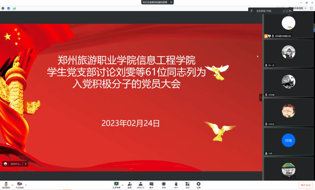 2023年02月24日下午13:00,信息工程学院学生党支部于腾讯会议召开关于讨论刘雯等61位同志列为入党积极分子的党员大会,学生党支部书记付佳、副书记赵翊君、以及全体学生党员参会。应到会党员21位,实际到会党员19位,因病因事请假2人,本次会议由支部副书记赵翊君主持。