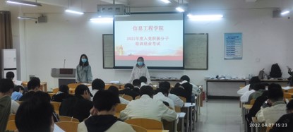 为提高入党积极分子的党务知识储备,端正入党积极分子的政治思想,加强入党积极分子对党识的学习能力,在校党委组织部统筹安排下,信息工程学院于2022年4月27日下午15:15在4b111教室进行对2021年入党积极分子进行党课结业测试。