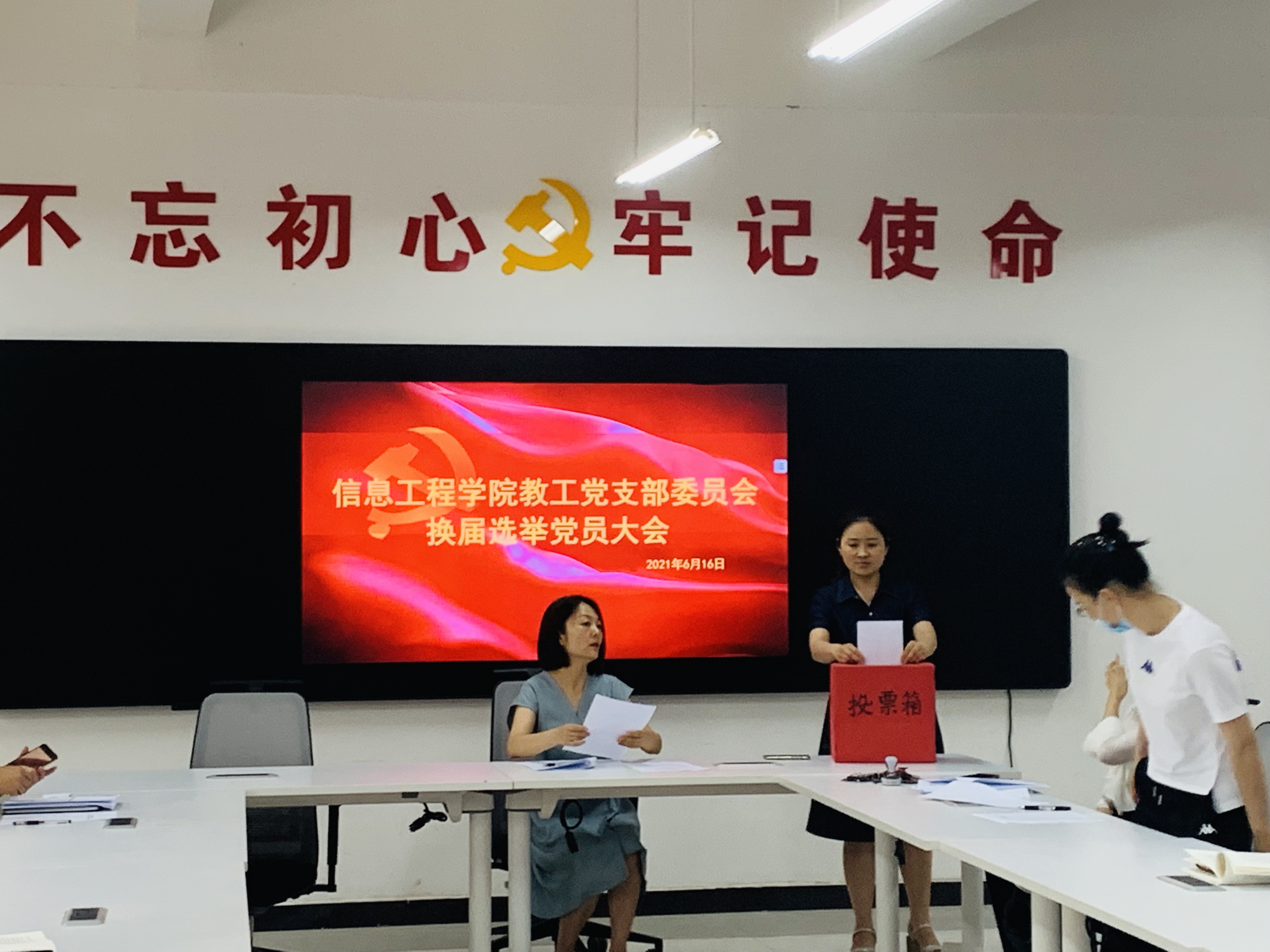 经学校党委批准,中共pp电子游戏平台网站信息工程学院教工支部委员会于2021年6月16日中午12:40在4A教学楼121会议室召开党员大会,审议本届委员会工作报告,选举产生新一届委员会。信息工程学院书记刘兆坤出席会议,民主党派人士代表王珂、教师代表杨怀磊、翟文彬列席会议。全体党员教师参会。