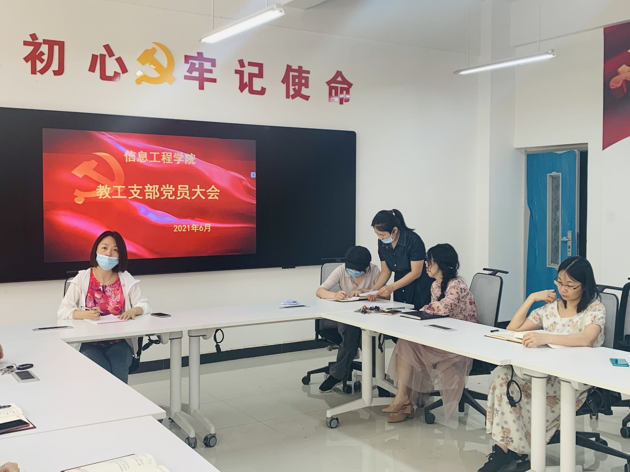 为发挥先进典型示范引领作用,激励党组织和广大党员在学院事业发展中鼓足干劲,在学院党委统一安排部署下,信息工学院教工支部于2021年6月04日12:50在4A121会议室组织召开党员大会,推荐支部优秀共产党员人选。信息工程学院党总支书记刘兆坤及教工支部全体党员参加此次会议。会议由教工支部书记李涛主持。