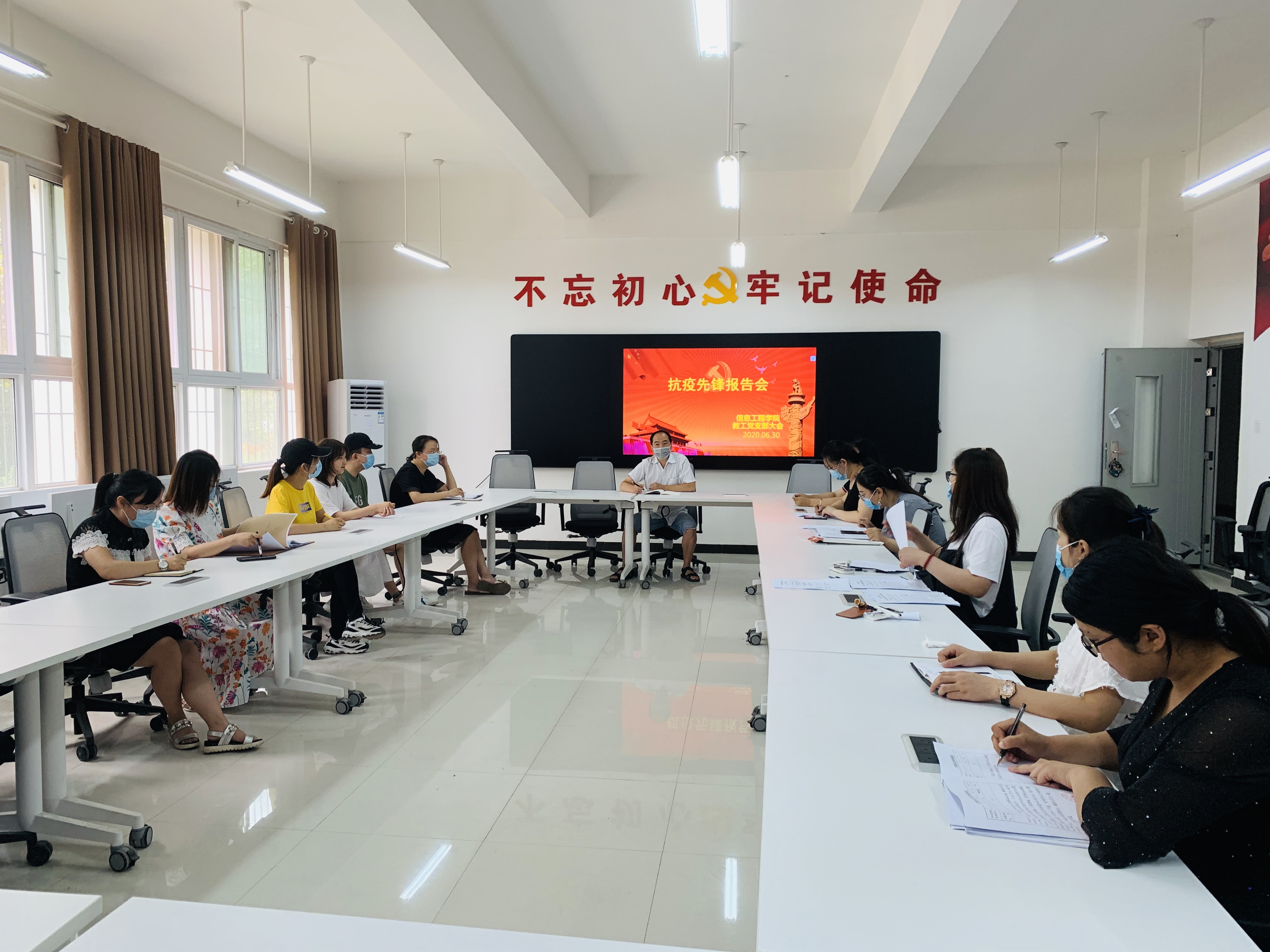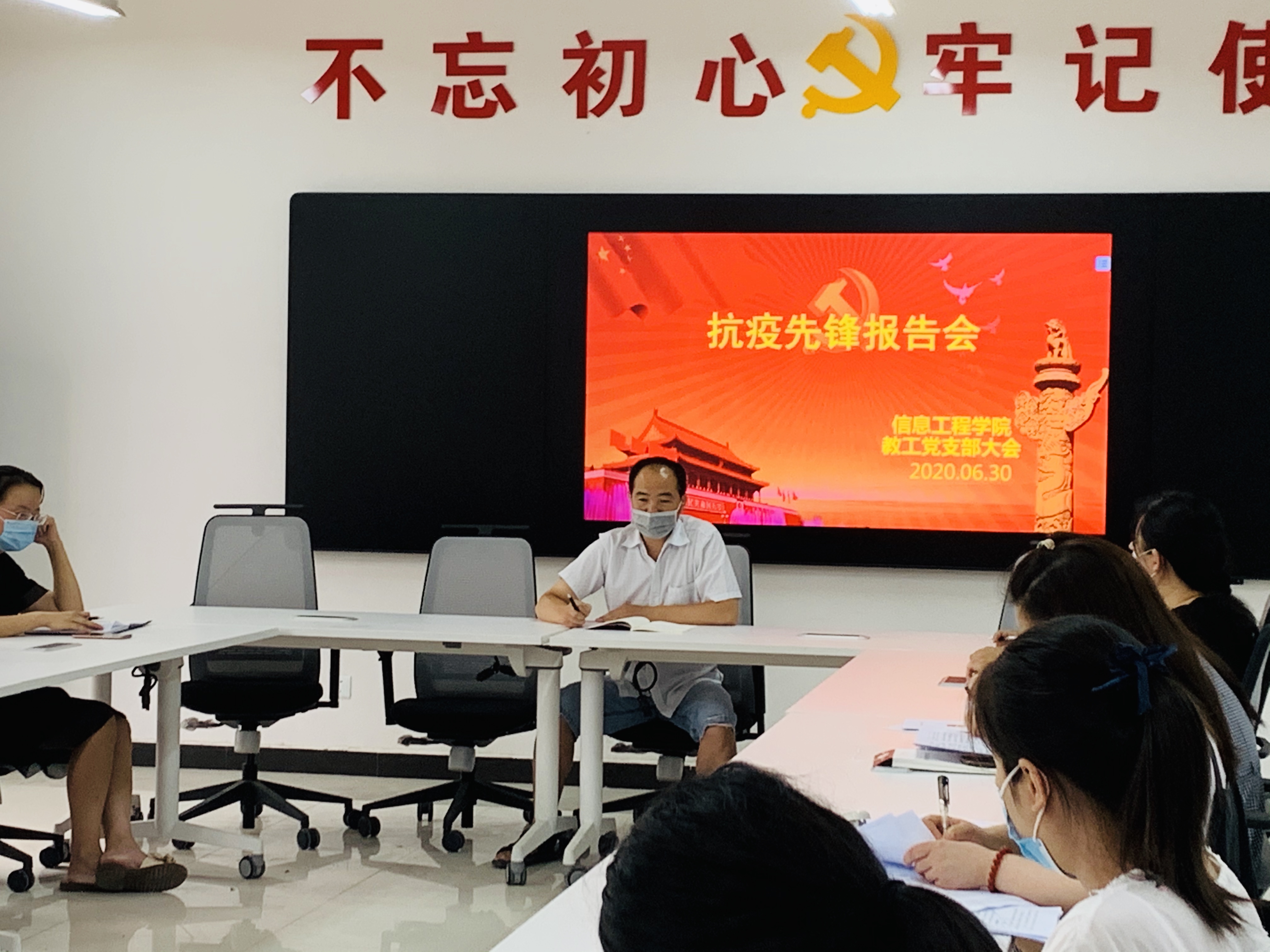 为庆祝建党99周年,激励全院共产党员“不忘初心、牢记使命”,以更加优异的成绩向党的100周年献礼,在学校党委统一组织安排下,2020年6月30日下午13:00,我院在4A教学楼一楼会议室举行支部党日活动:邀请抗疫一线优秀共产党员何少情老师作交流报告,院长潘宁,副院长杨慧丽和全体党员参加会议。