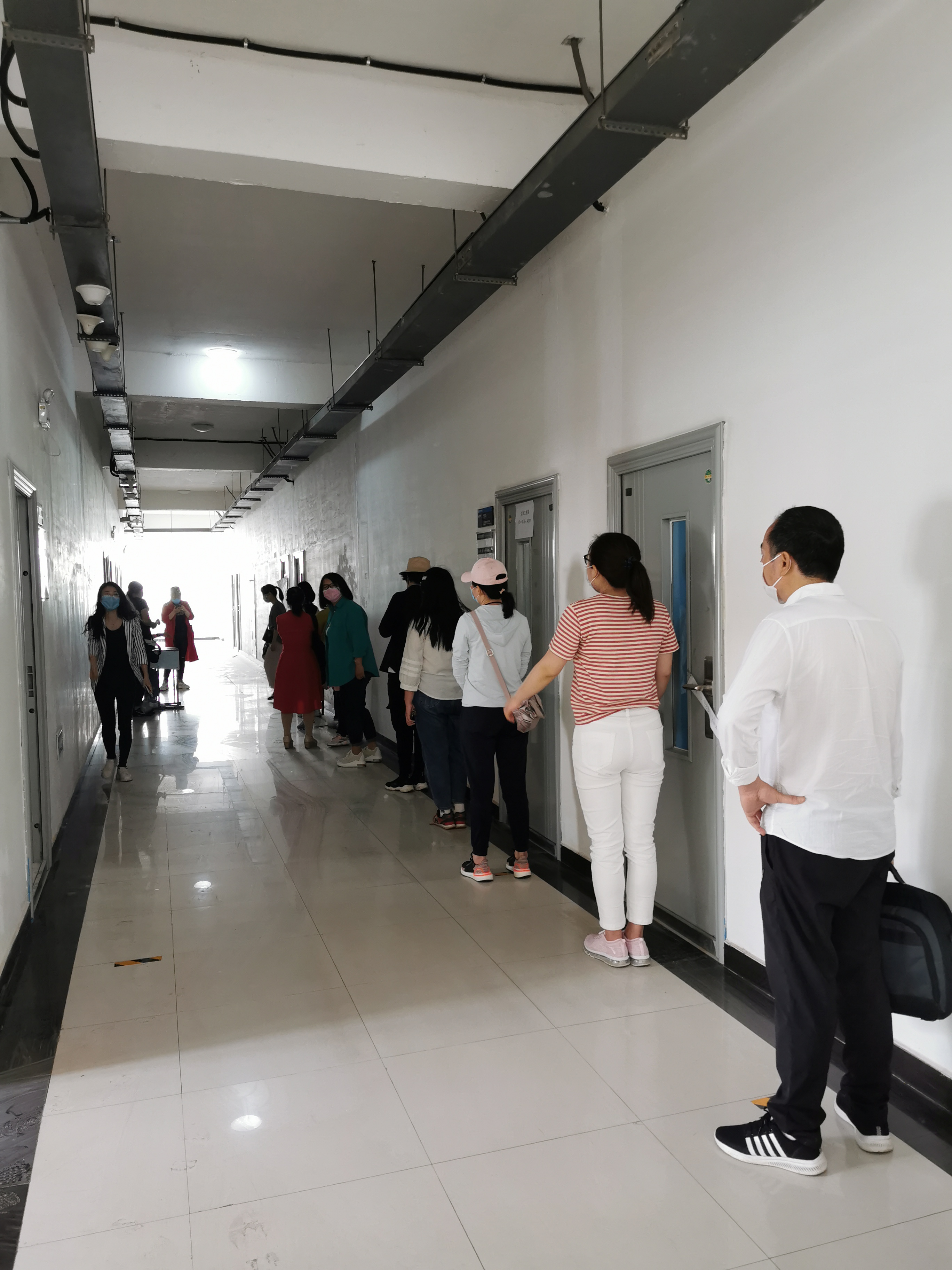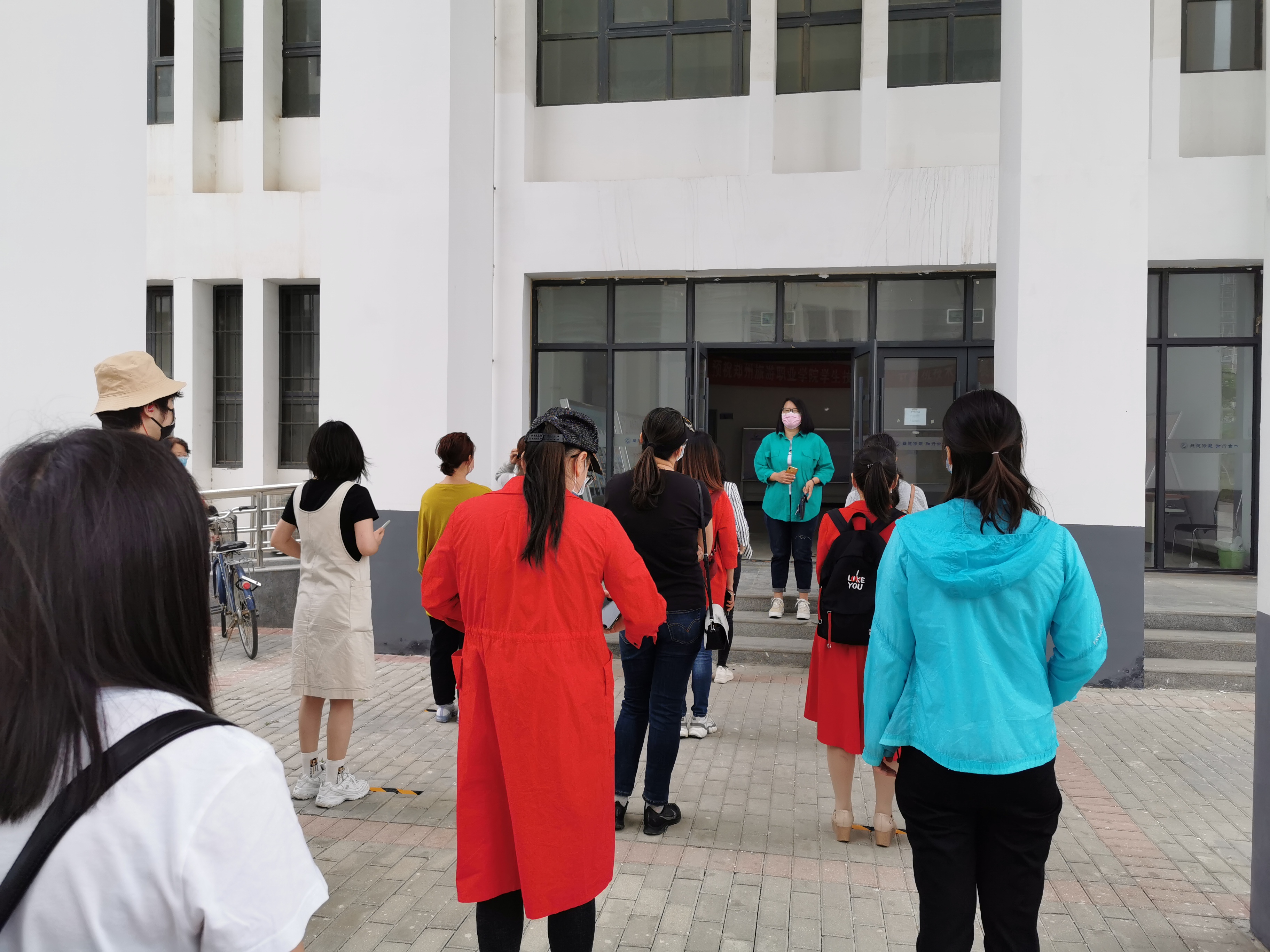 模拟返校的演练环节开始,老师们戴着口罩,在工作人员的引导下进入演练现场,按照地上的提示线排好队,严格按照我院防疫演练流程进行。