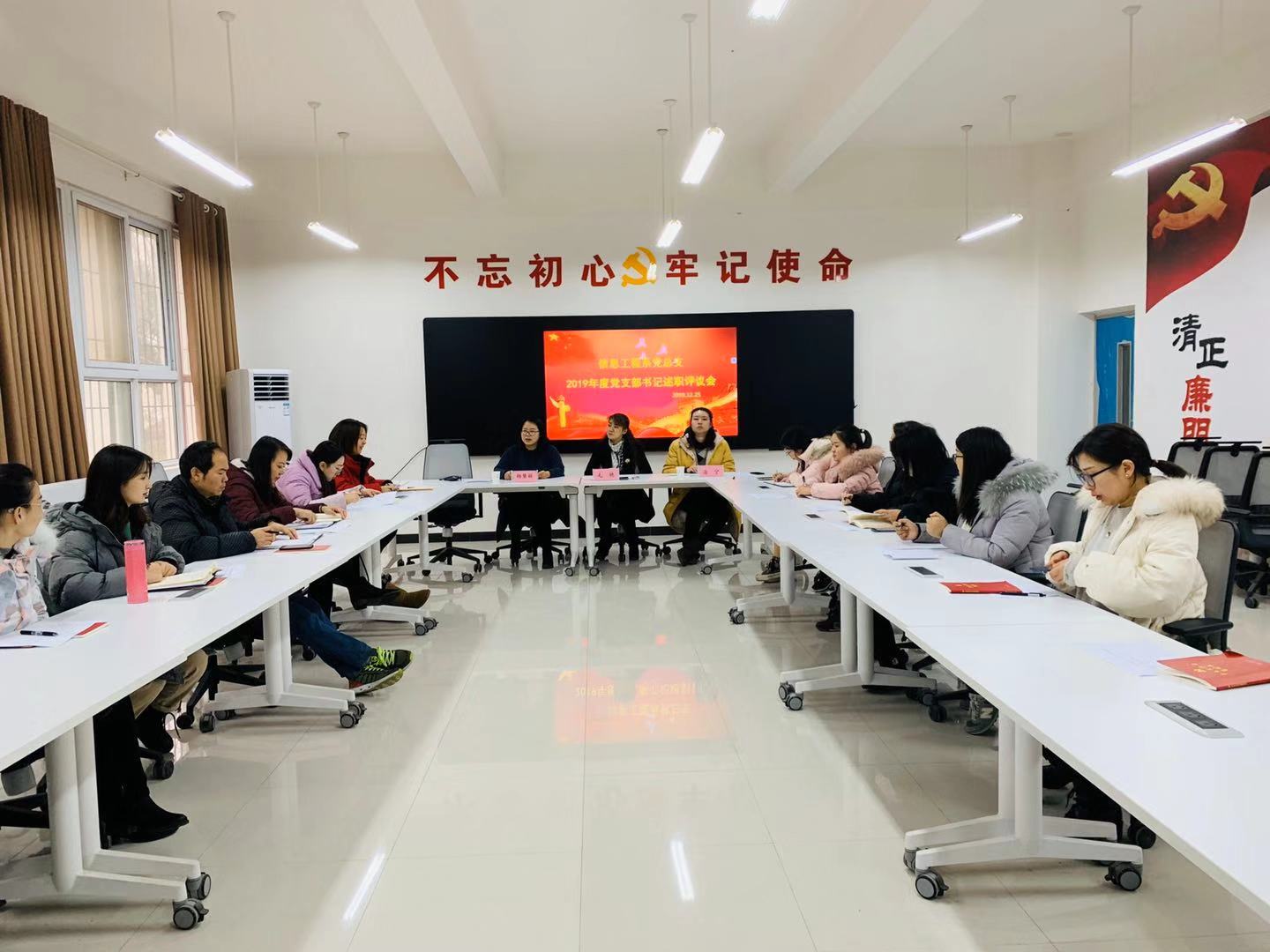 12月26日中午1:30,我系在4A教学楼一楼会议室召开2019年度党支部书记述职评议会。会议由系副主任杨慧丽主持,出席会议的有院纪委书记毛艳、系副主任潘宁和全体党员教师。