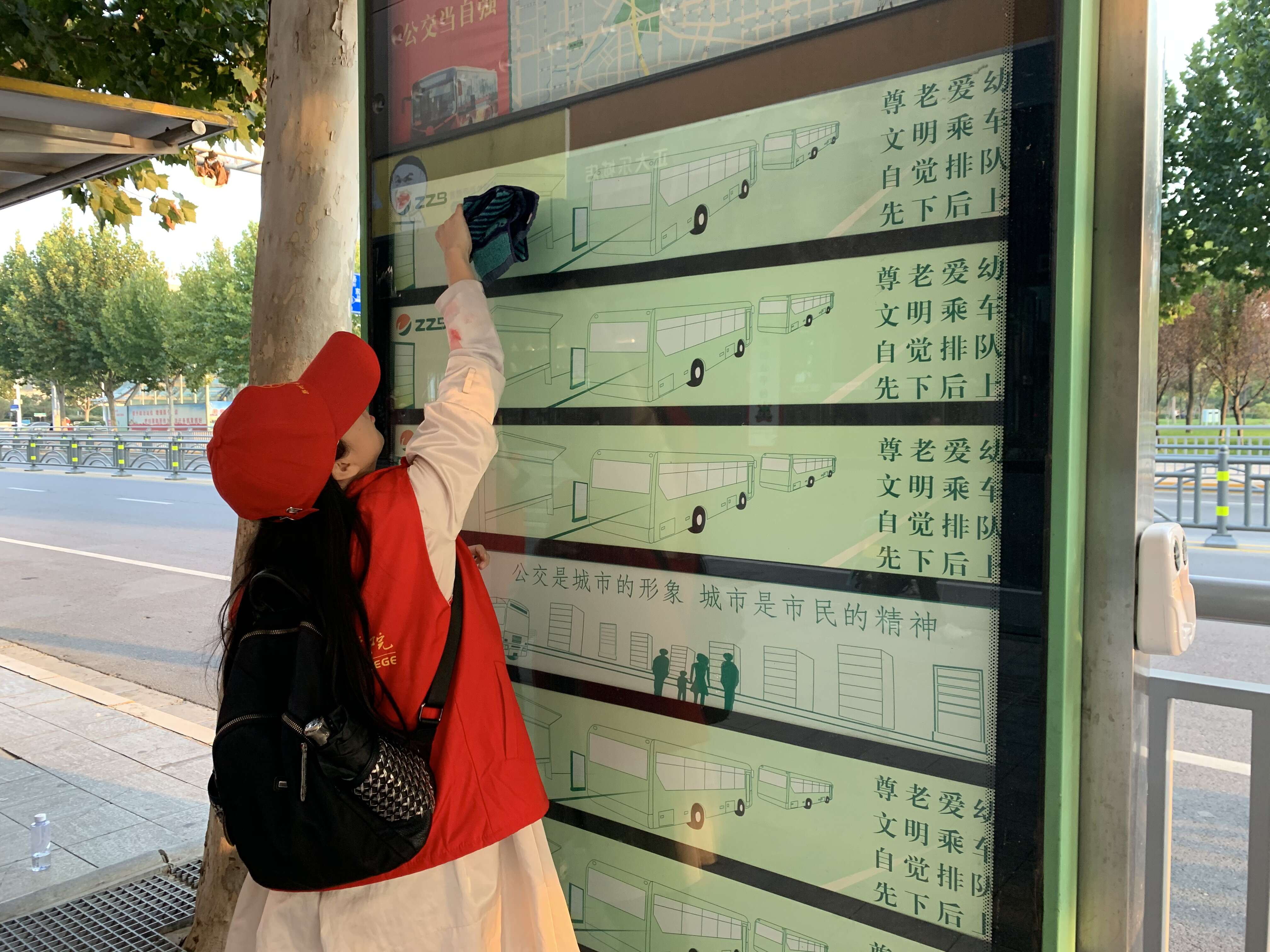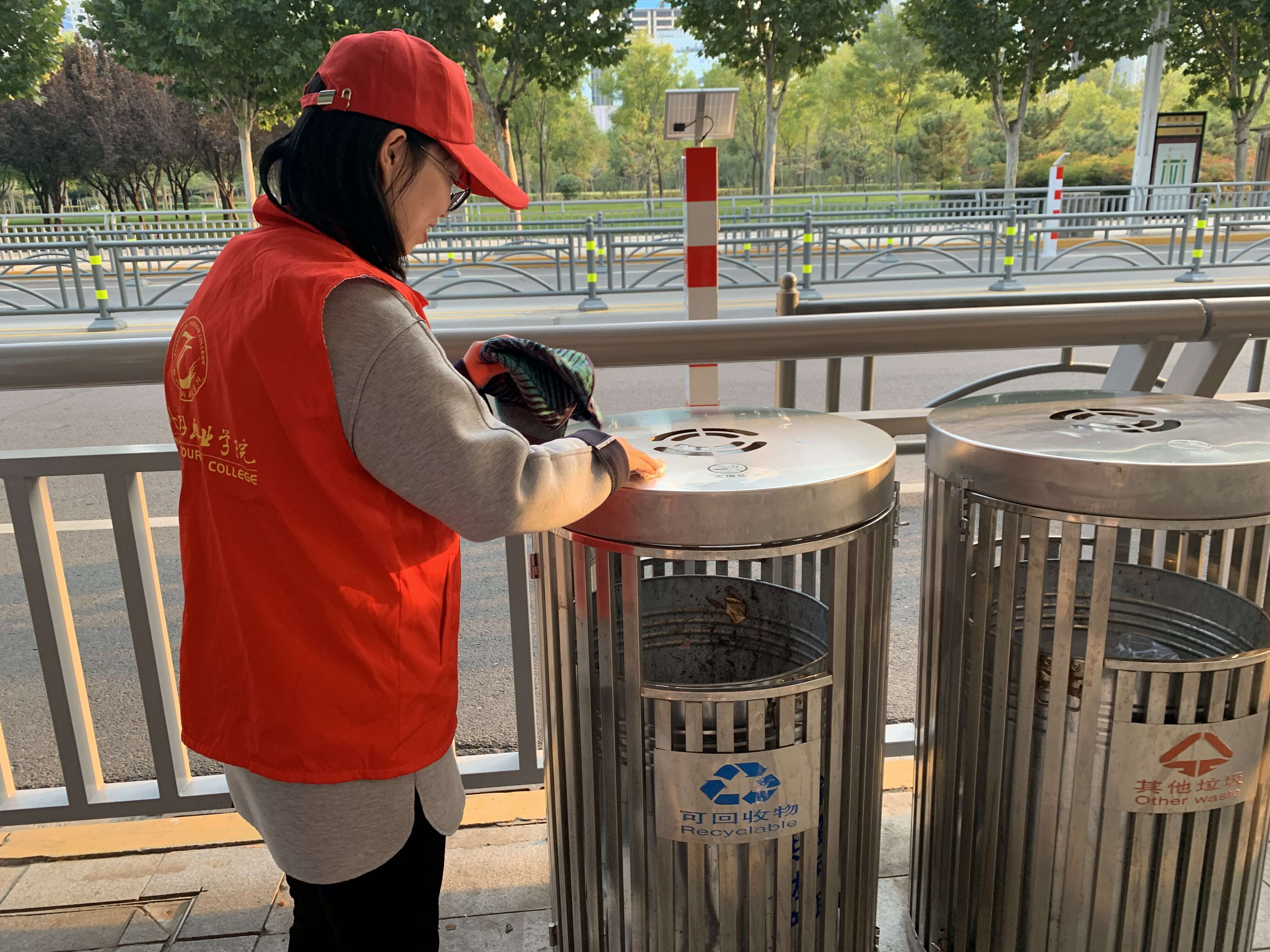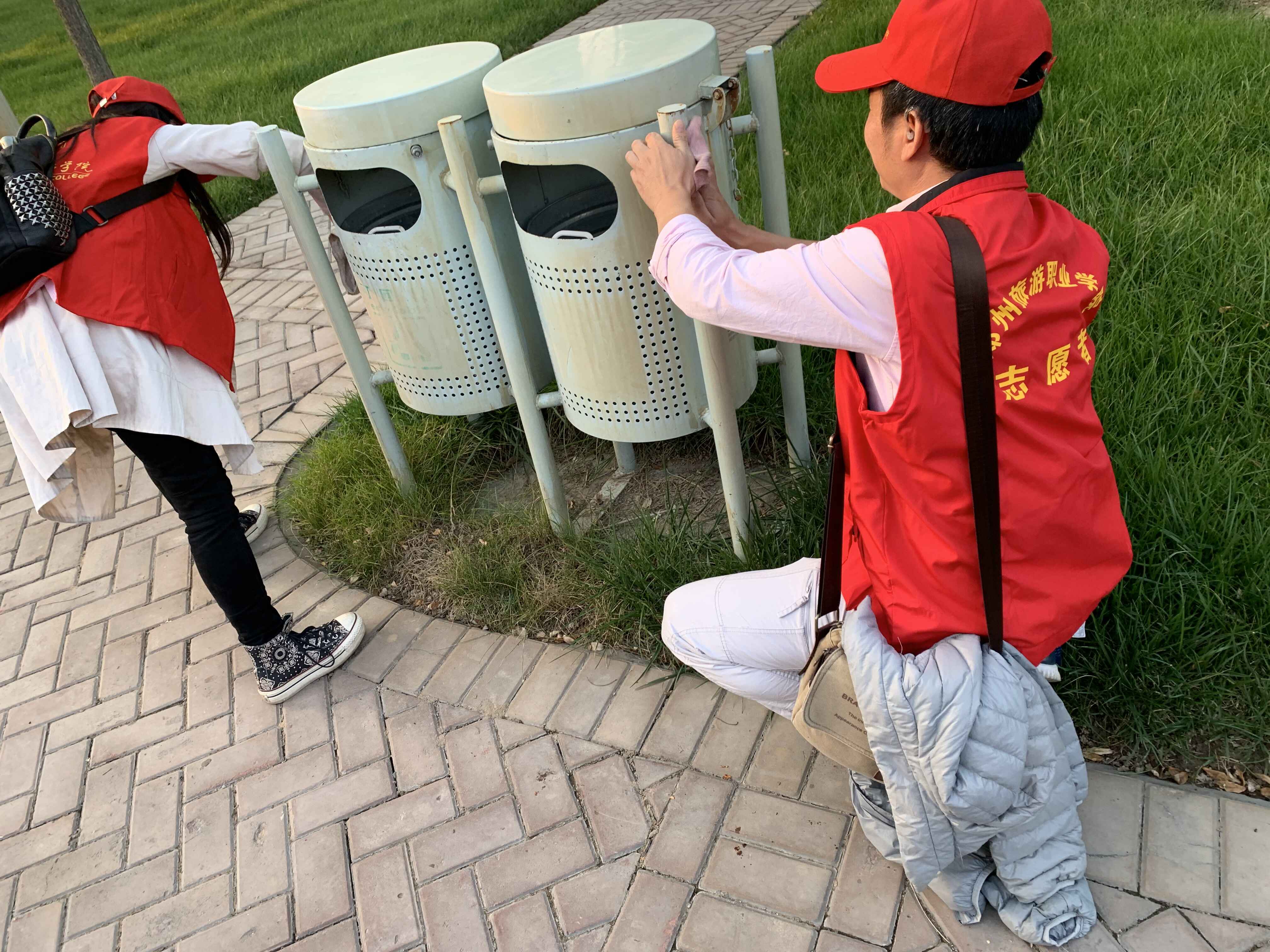 我系党员教师下课后集体来到郑州东站,对东站附近的公交站牌、垃圾箱进行擦洗服务,党员教师们不怕脏不怕累,用抹布认真清理公交站牌和垃圾箱上的污迹。市民们还热情问候赞赏了老师们的服务精神,老师们以灿烂的笑容回应,温暖升上心头。