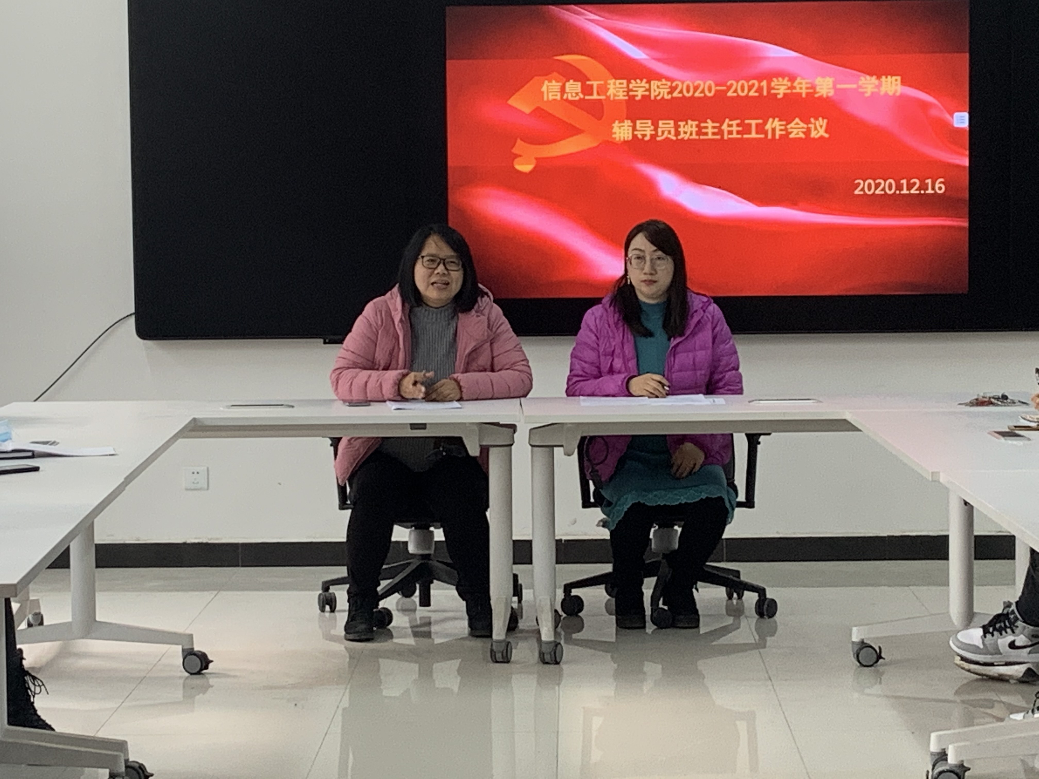 信息工程学院于2020年12月16日13:00在4a119召开班主任辅导员工作会议,与会人员包括副院长杨慧丽、团总支书记李舒、各位在校班级班主任和辅导员。