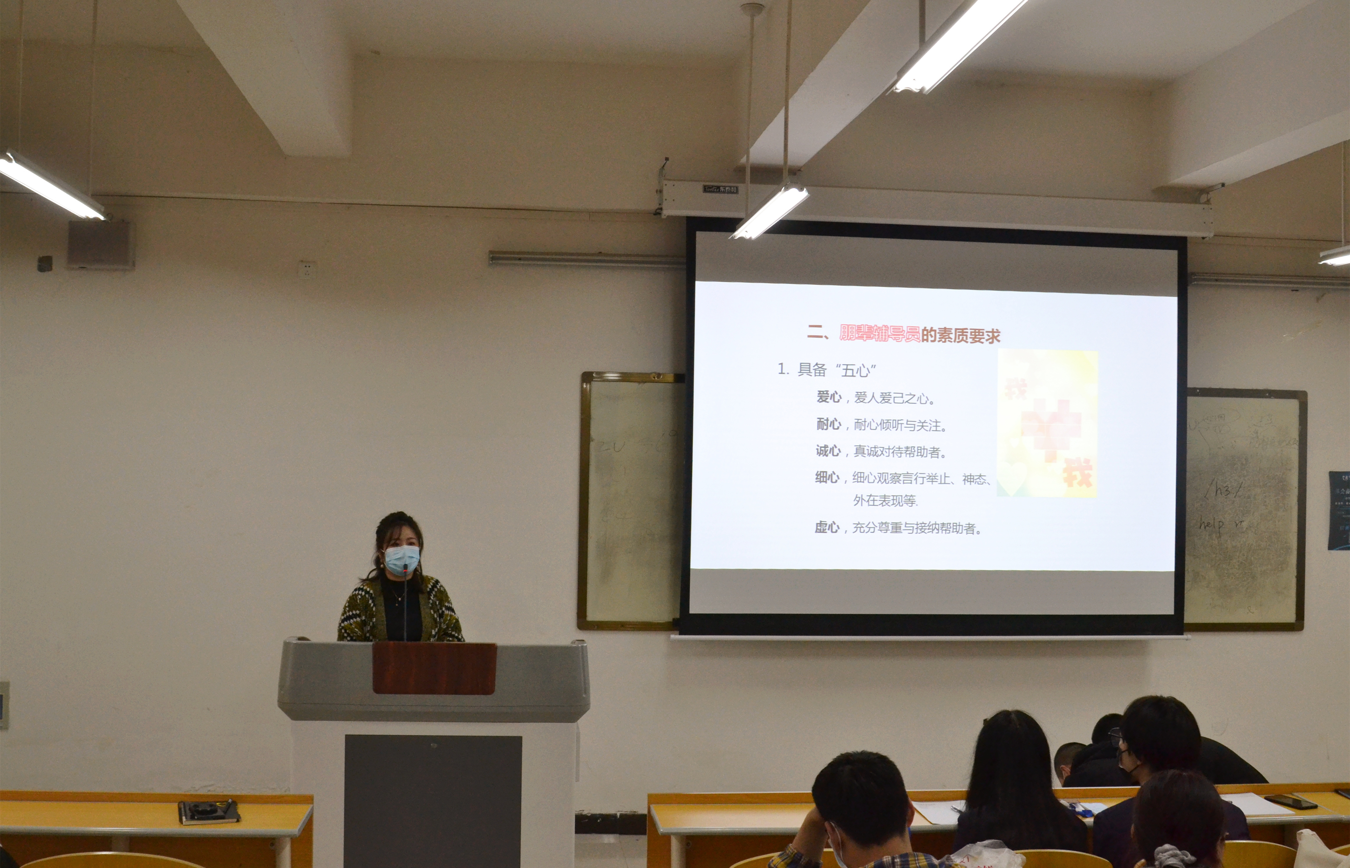 最后,付佳讲解了朋辈辅导的针对性方法和技巧,强调在朋辈辅导过程中,心理委员要学会观察、学会倾听、学会助人,应以共情、支持、探索、中立的姿态,启发式地帮助同学。