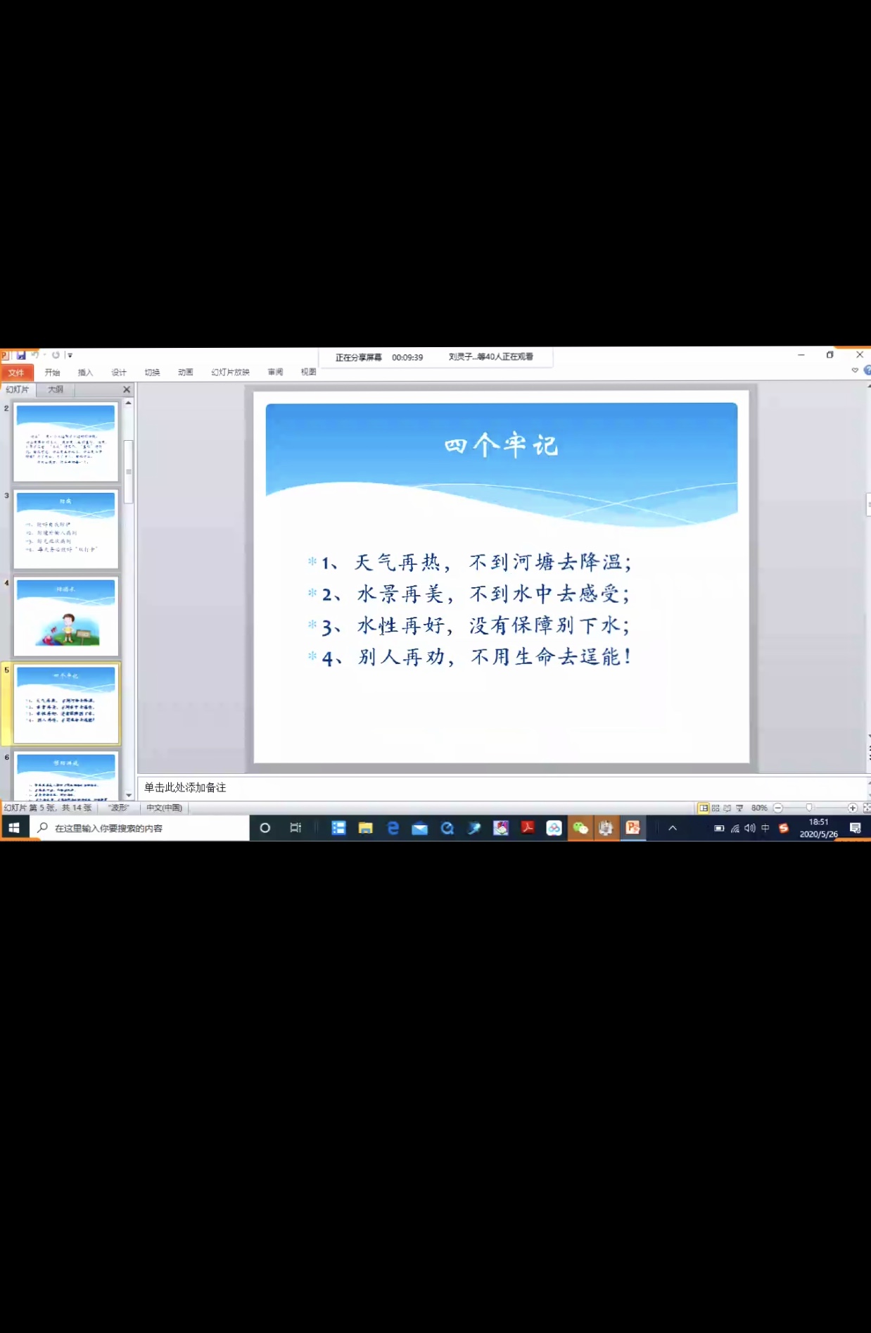 本次安全教育主题班会的开展,为全体同学再次敲响了安全的警钟,使其更加明白了安全的重要性,更好地做到“举安全之盾,防事故之患”。