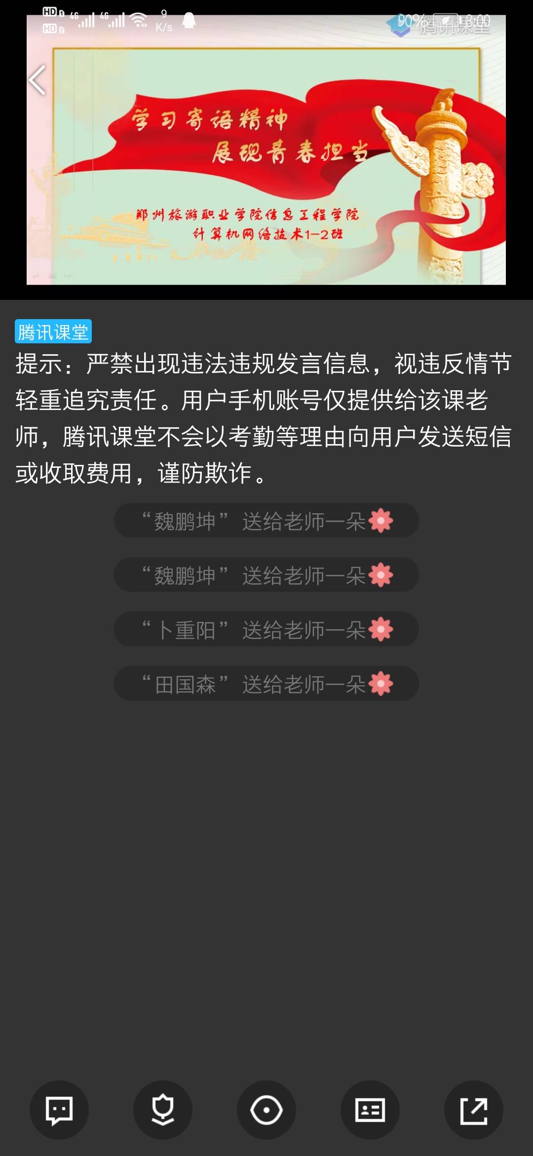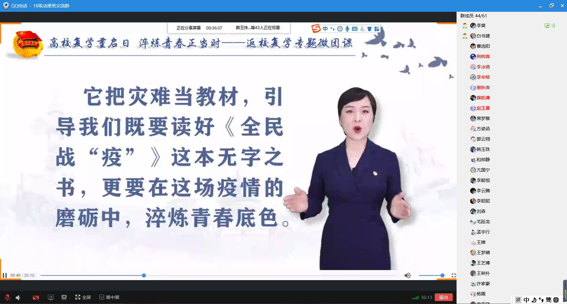 班会中,老师们要求把学习宣传贯彻习近平总书记五四寄语精神作为体现和增强先进性的重要途径,切实做到积极学习、主动宣传、自觉践行,在更好履行个人职责、在党的工作总目标的历史进程和接力赛跑中,在新时代壮丽画卷上共同谱写广大青年的壮美青春篇章。