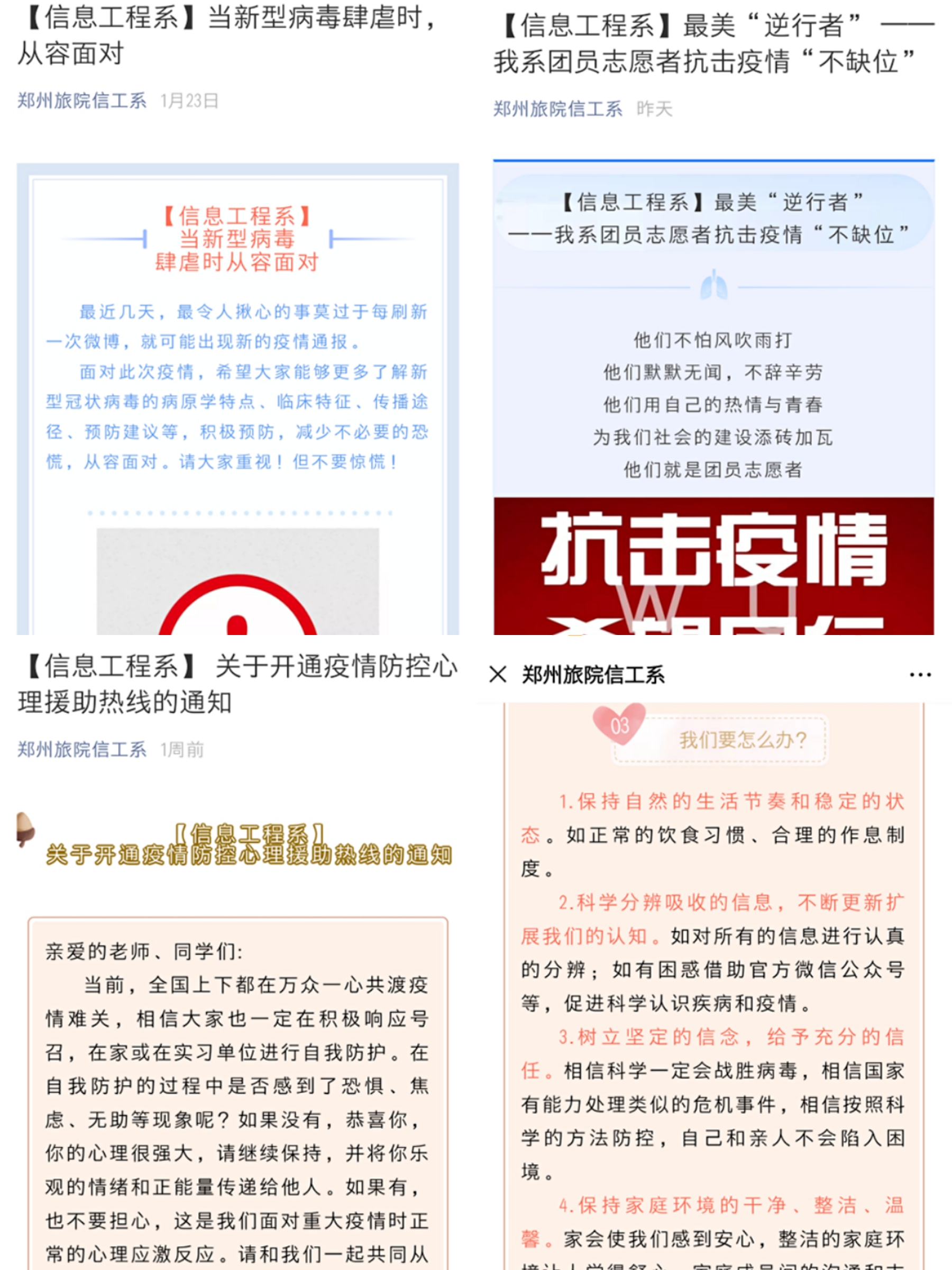 我系辅导员付佳带领宣传部学生干部们,发挥新媒体优势,通过我系微信公众号,编写发布网文《当新型病毒肆虐时,从容面对》,引导学生坚定“战疫”信心,埋首积蓄力量,静待春暖花开;发布《关于开通疫情防控心理援助热线的通知》让学生们学会认知自己的心理状态,学习如何应对与调整,有问题及时求助;发布《最美“逆行者”——我系团员志愿者抗击疫情不缺位》,为师生们传递正能量,坚定我们打赢这场“战役”的决心。这种“键对键”“点带面”的网络工作法受到了同学们热情关注和大力支持。