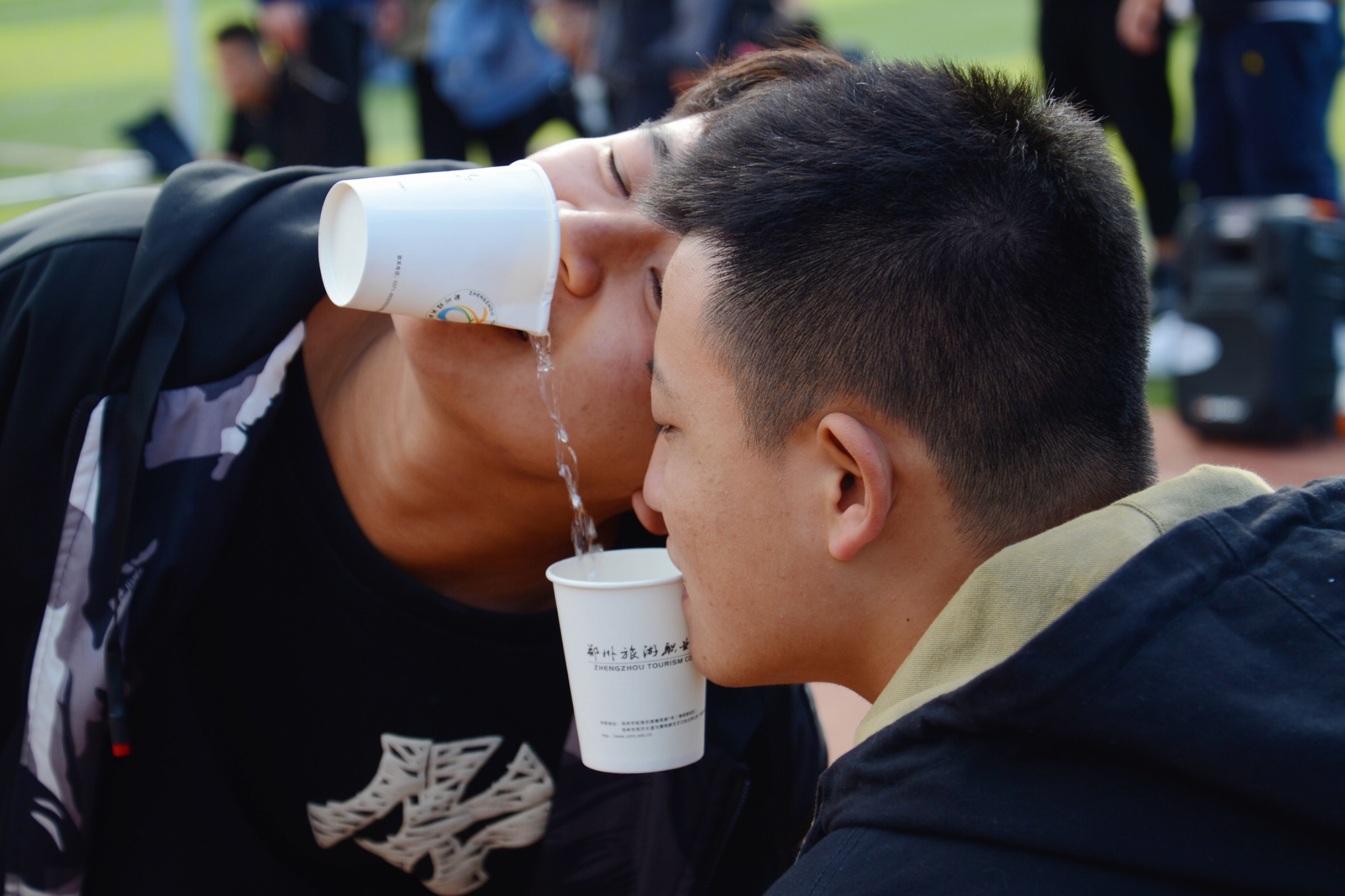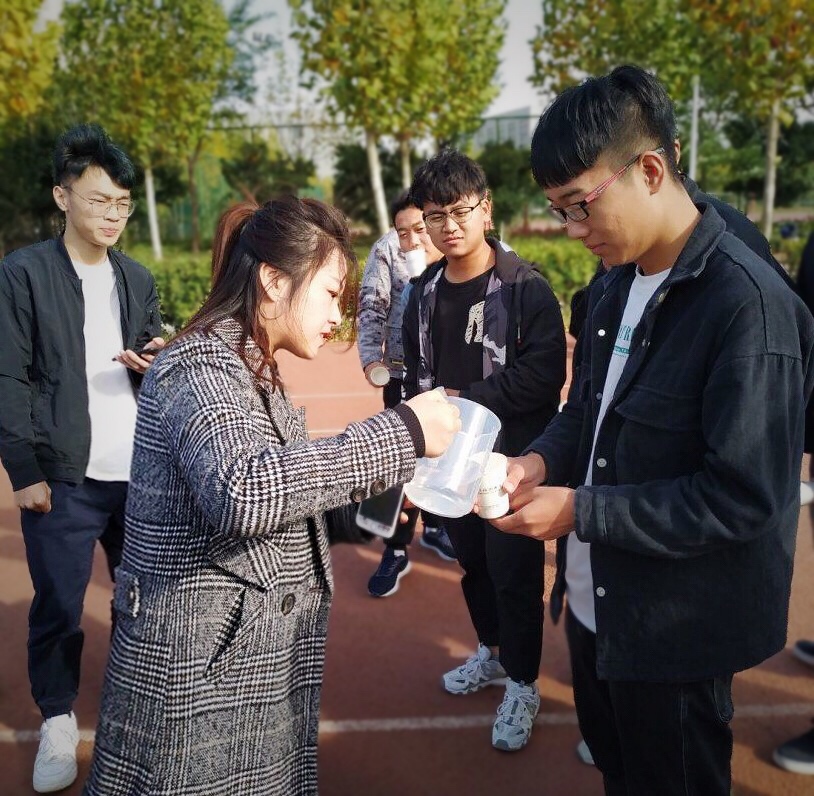 “叼杯子运水”活动,由辅导员付佳老师用量杯为各队同学的杯子里加入等量的水,以保证比赛公平。在游戏中大家努力的配合自己的队友,进行水的传递,最终游戏在大家的欢声笑语中结束。