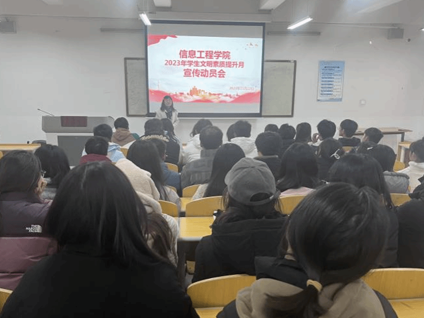 为进一步加强提升学生文明素养,落实立德树人根本任务,实现学生的综合发展,信息工程学院于11月22日下午在4b111召开学生文明素养提升月宣传动员工作会,信息工程学院党总支书记周鹏、全体专兼职辅导员以及学生干部参加会议,会议由周鹏书记主持。