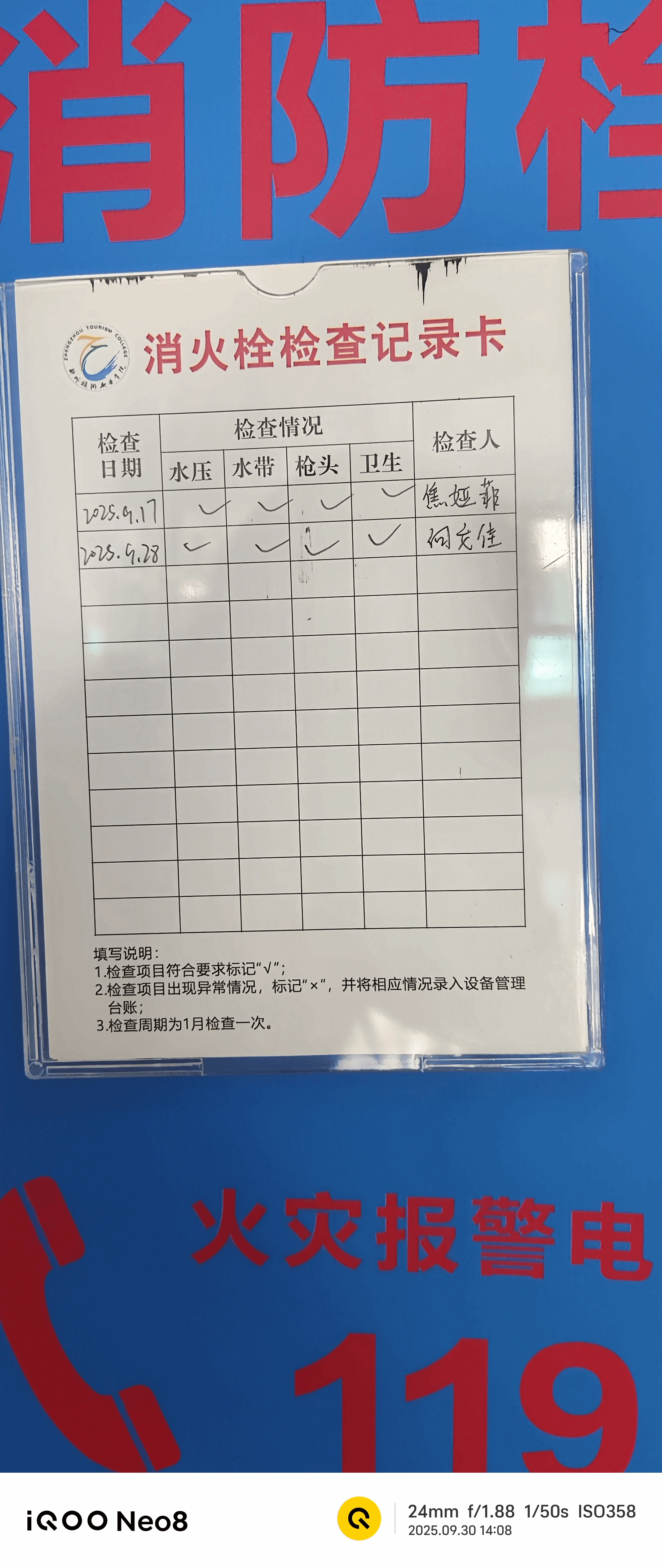 本次检查重点聚焦教学楼消防设施与安全通道两大关键领域。在消防设施核查环节,检查人员逐楼层、逐区域对灭火器进行细致排查,不仅仔细查看灭火器外观是否完好、压力值是否处于正常范围,还逐一核对生产日期与有效期,确保每一台灭火器均能在紧急情况下正常投入使用。同时,针对教学楼内的消火栓,检查人员重点检查了 “消火栓检查记录卡” 填写情况,确认所有记录均已更新至 9 月,保障消防设施管理的规范性与时效性。