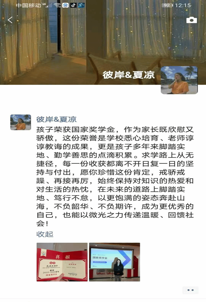 活动中,学院通过精心设计的喜报、合影留念、家长寄语等多种形式,真实记录了获奖学生与家庭共享荣耀的温馨时刻。家长们在收到喜报后,纷纷通过朋友圈、短视频等方式表达喜悦与感激之情,展现了家校共育的良好氛围。