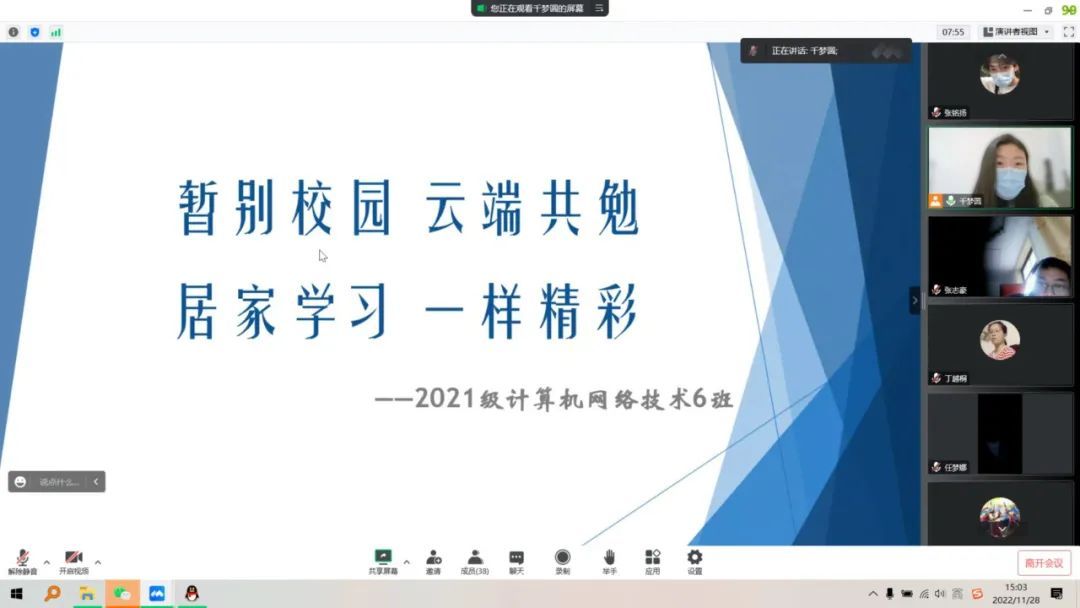 为引导学生深入了解目前疫情防控的严峻形势,认真居家上网课,积极配合防疫工作并做好居家自我防护。信息工程学院于11月28—29日组织各班召开 “暂别校园、云端共勉、居家学习、一样精彩”的线上主题班会。