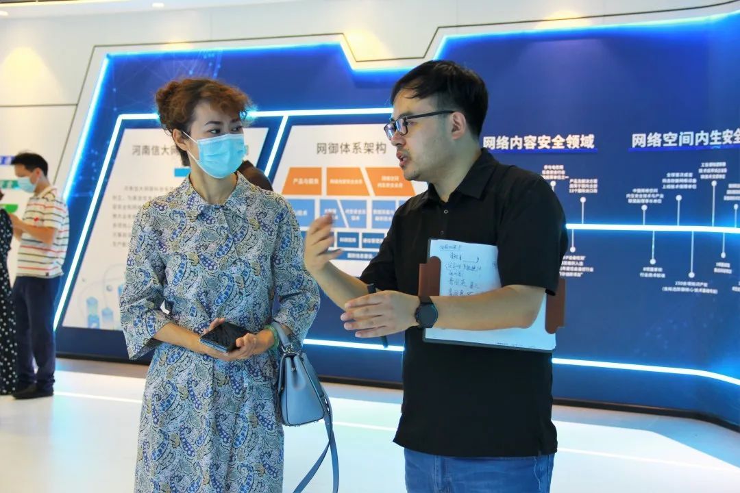 毛艳书记一行在郑州金水科教园区管理委员会副主任钟雨和郑州金水科教园区管理委员会企业服务中心主任崔琦的陪同下,现场走访了郑州金惠计算机系统工程有限公司、河南信大网御科技有限公司和山谷网安科技股份有限公司。
