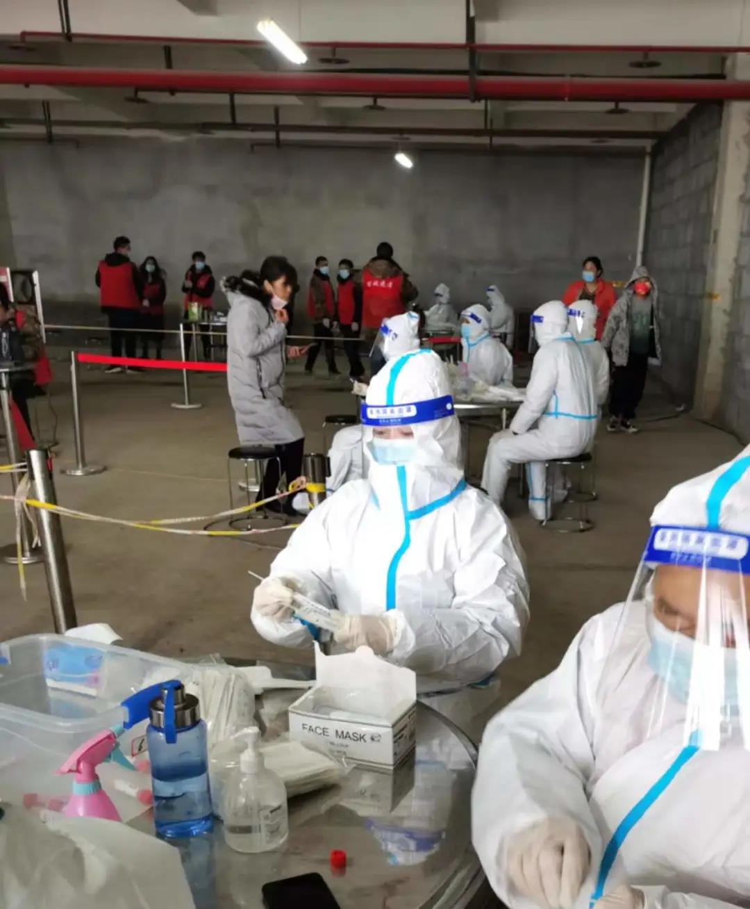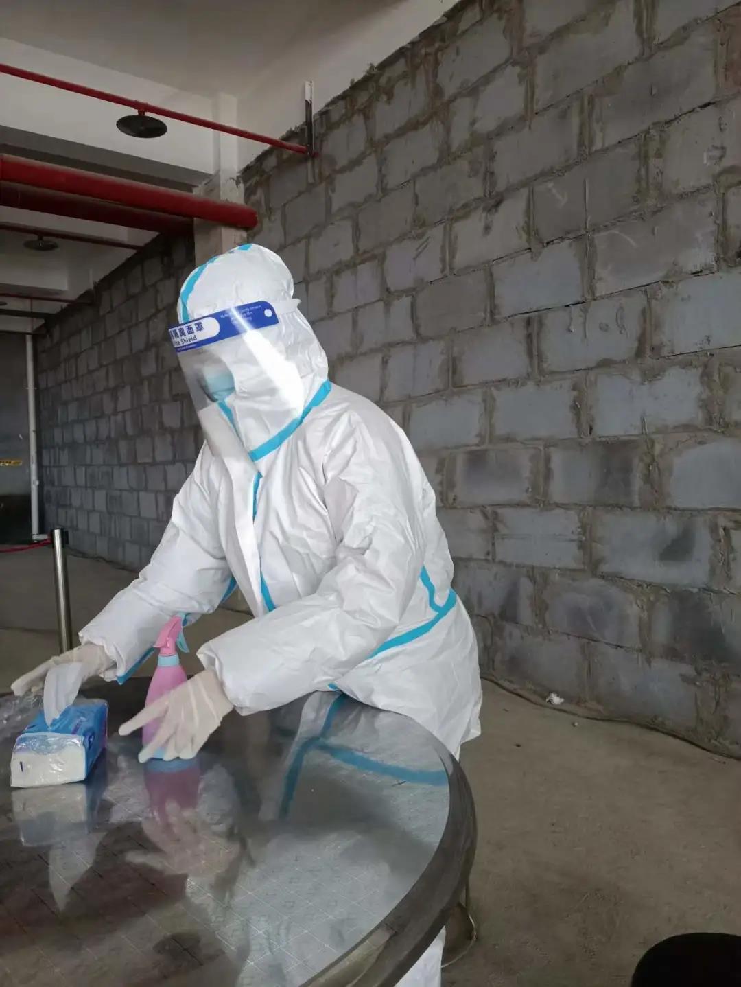 社区防疫人员早早确认核酸检测的流程,准备检测需要的棉签、酒精等一系列物资。她在检测最重要环节中,帮助检测人员,拆、递棉签。除了引导检测、维护秩序的志愿者们,其他人都穿上了防护服,带着一次性医用手套和透明的防护罩。