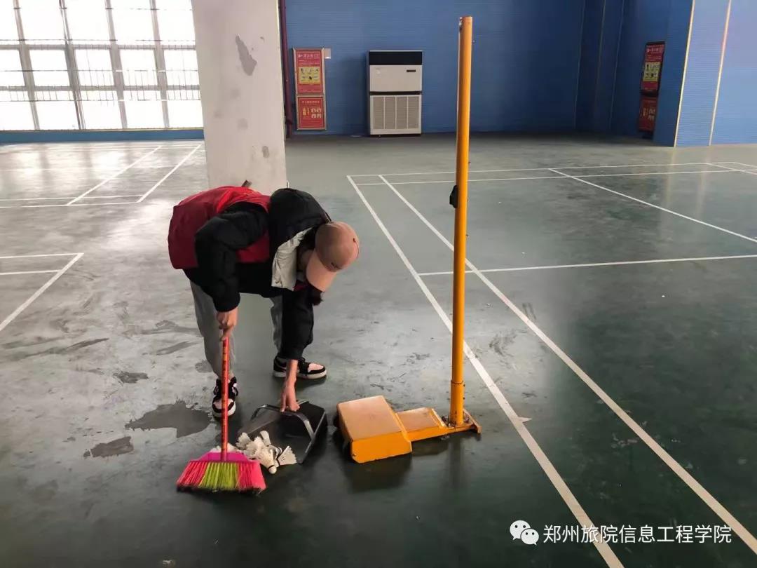 大家分工明确,1班男生多女生少,打扫西侧,2班女生多男生少,打扫东侧。先是用笤帚清扫掉地上废弃的羽毛球及附属脏物,细心地清扫掉每一个角落里的綷纸屑及落尘,然后是大家发挥团队优势,集体把久末打理的地面拖和一干二净,大家兴致高昂,在劳动的间隙里,姬亚楠同学还现场跳起了拖把舞,同学们欢歌笑语,时不时还因为看到了角落里不知名的小虫虫而尖叫。。。。