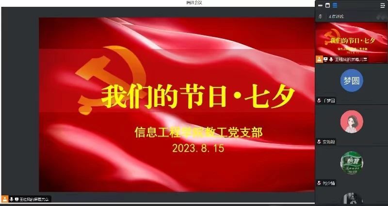 七夕节,又称七巧节、女儿节、乞巧节等,是中国民间的传统节日,在七夕节到来之际,为充分发挥传统节日在弘扬中华民族优秀文化建设中的载体作用,讲好党史故事,传承红色基因,信息工程学院在七夕节前举办了“我们的节日·七夕”活动,教工党支部和学生党支部成员全体参与。