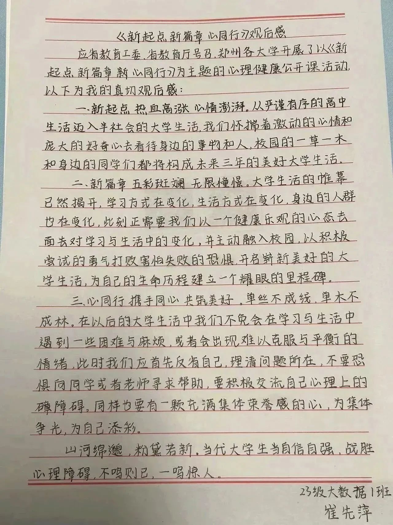 我今天认真观看了“新起点、新篇章、心同行”主题心理健康的公开课,通过这次公开课的学习,我对心理健康教育方面的知识有了更深的认识,也让我意识到进一步加强大学生心理健康素养,帮助他们形成正确的世界观与人生观,提高他们的心理调适能力,帮助他们尽快适应新学期,使他们拥有健康的心理,是我们老师的重要责任,也将是我以后工作的重心。