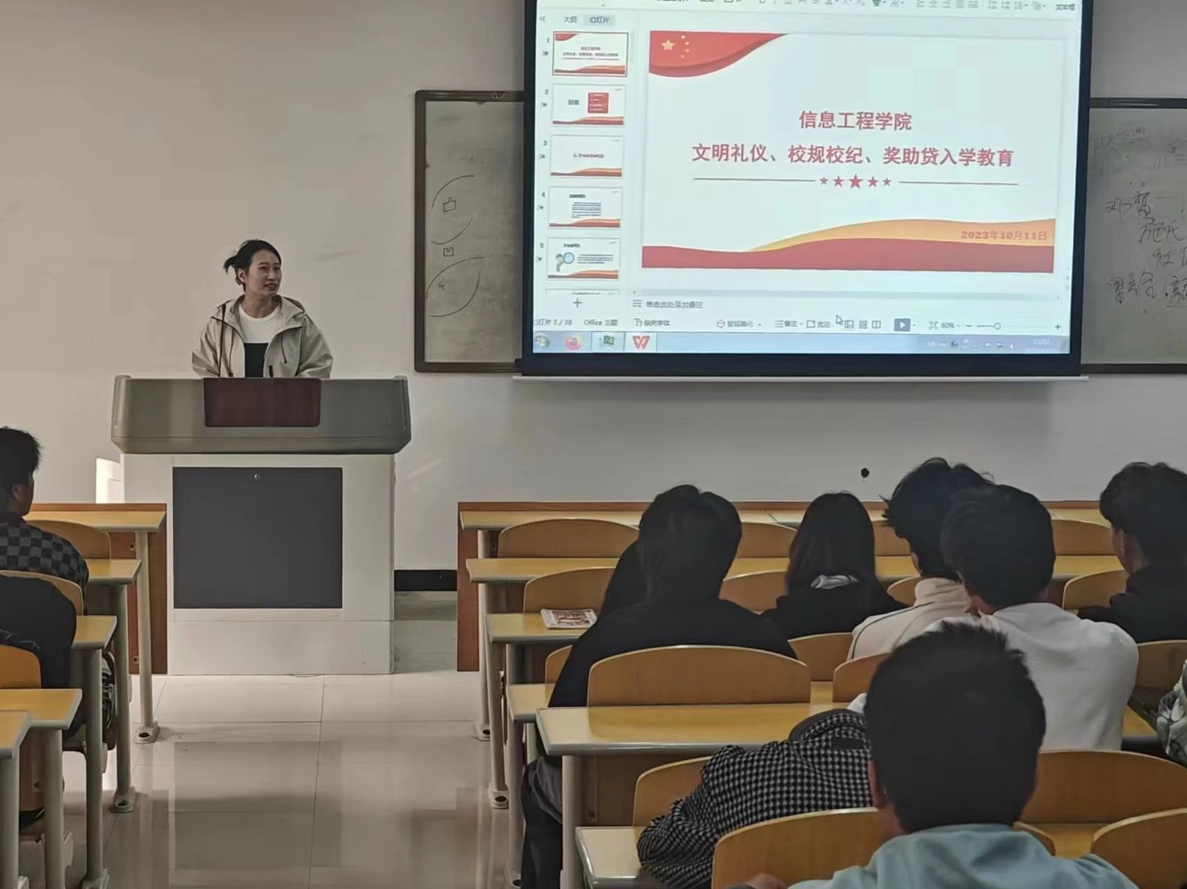 为推进文明校园建设,严肃校规校纪,弘扬文明学风,进一步提升pp电子学生的文明礼仪素养。2023年10月12日下午3点,信息工程学院辅导员老师李雯于4B111会议室开展了一场关于文明礼仪教育和校规校纪教育的会议。