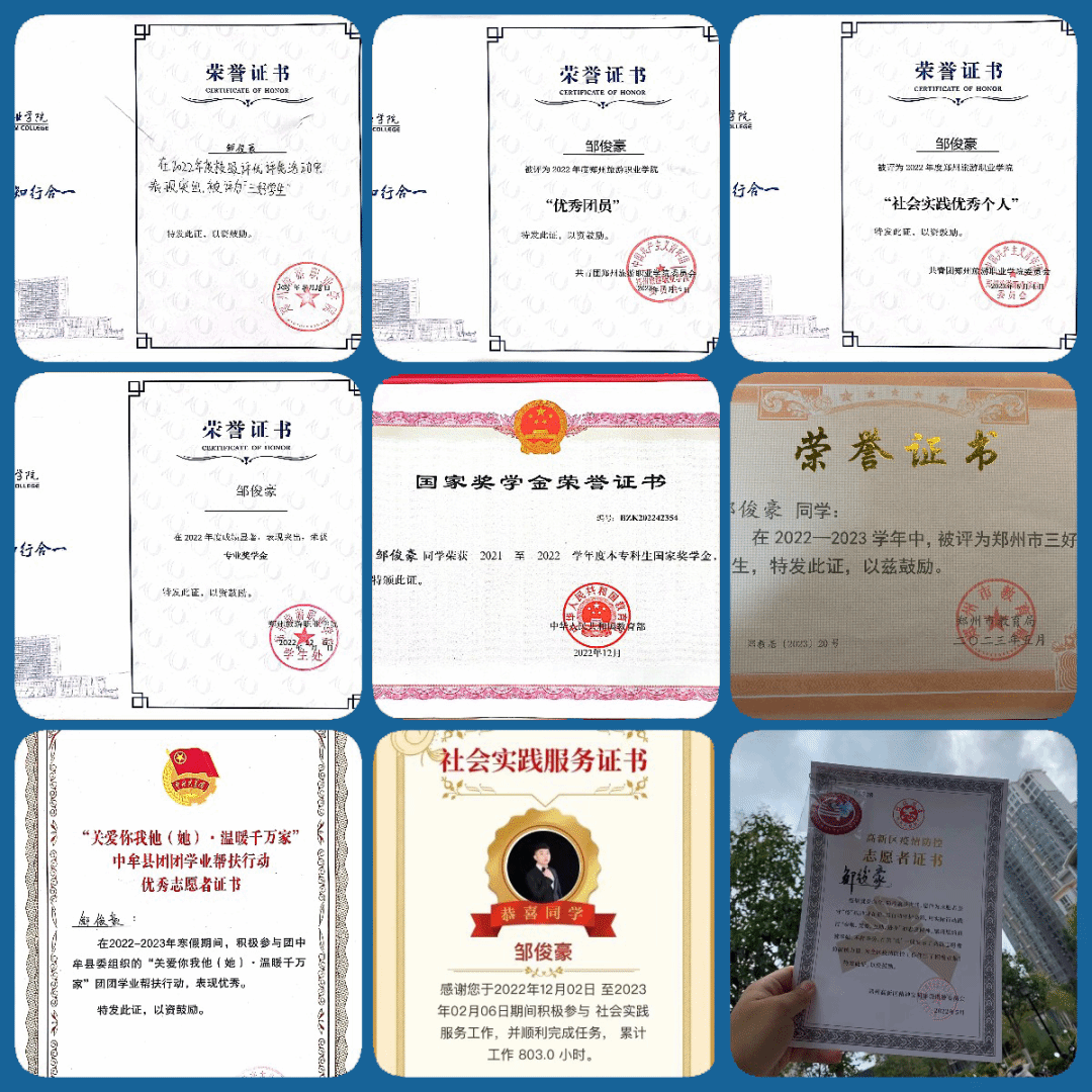 2023年3月份获得校级“三好学生”、“社会实践优秀个人”荣誉称号、5月份获得市级“三好学生”荣誉称号、8月份获得省级“三好学生”荣誉称号,10月份获得“国家励志奖学金”。