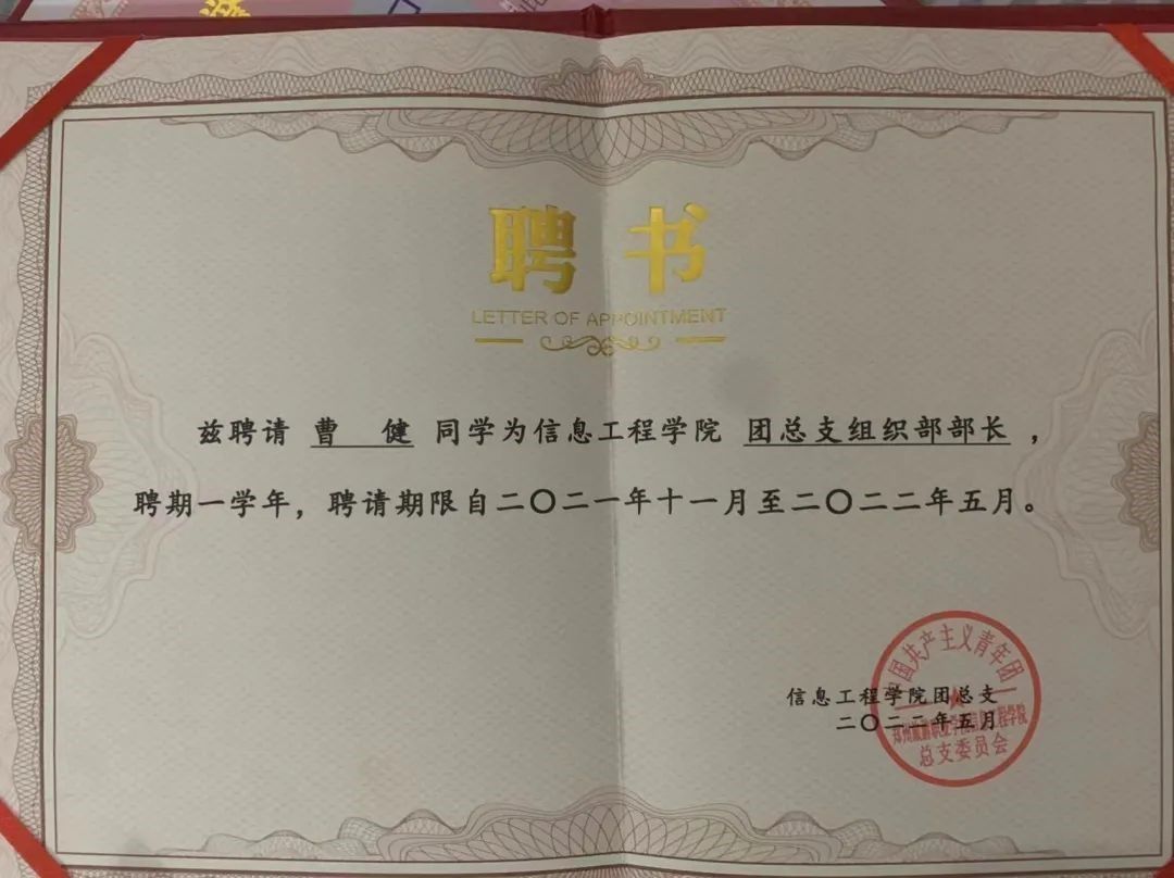 曹健,男,汉族,中共预备党员,毕业于pp电子游戏平台网站信息工程学院20级计算机网络技术1班,在校期间曾担任pp电子游戏平台网站信息工程学院组织部部长,大三实习期间担任pp电子游戏平台网站学生助理一职。