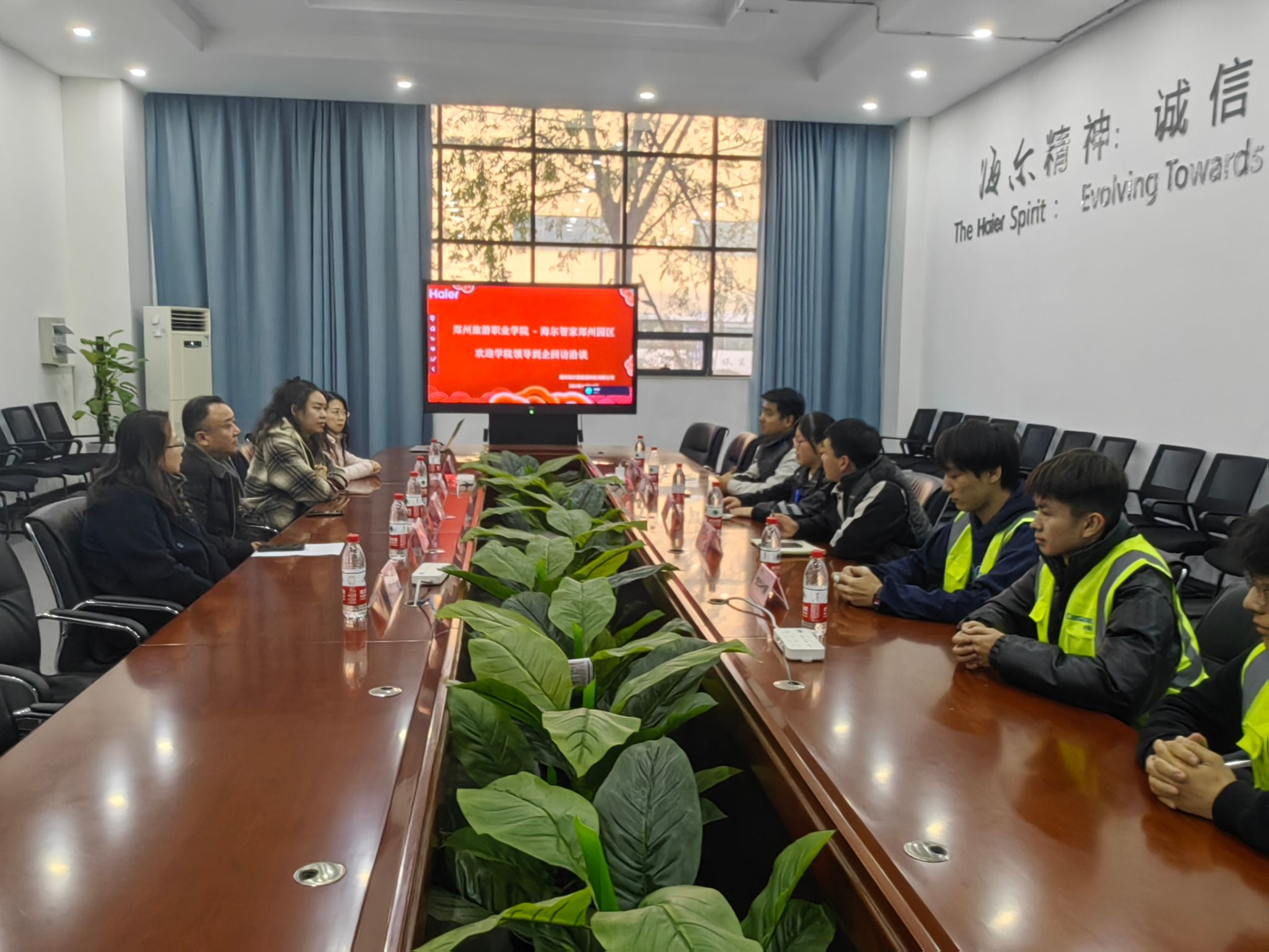 当天,郑州海尔新能源科技有限公司方面热情接待了我院的到访人员。我院领导、教师直接深入企业与一线生产车间工作中的学生进行交流,了解岗位情况及学生工作情况。之后双方开展了深入的交流。企业赵晓变经理详细介绍了学生们的实习安排、工作内容以及他们在实习期间的整体表现。周鹏书记对企业为学生提供实习机会表示诚挚的感谢,并表示企业的实习环境和丰富的实践资源对学生的职业素养提升有着不可替代的作用。