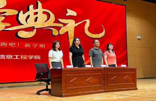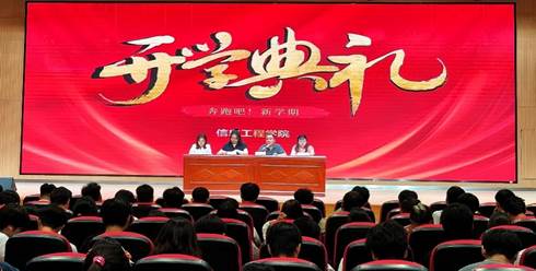 9月8日下午,信息工程学院在后勤楼二楼报告厅召开2025-2026学年第一学期开学典礼,学院党总支书记周鹏、院长潘宁、团总支书记李舒出席典礼,学工办代主任付佳主持。