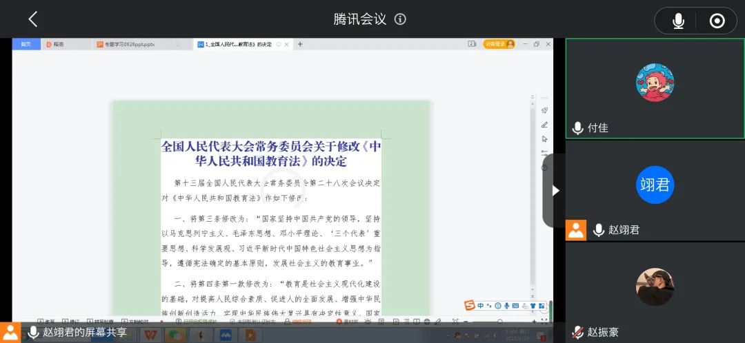 副书记赵翊君带领大家认真学习了《全国人民代表大会常务委员会关于修改<中华人民共和国教育法>的决定》《中国共产党普通高等学校基层组织工作条例》《习近平“七一”重要讲话——九个必须》《总结党的历史经验 加强党的政治建设》等四个重要文件,着重强调了高校党组织必须高举中国特色社会主义伟大旗帜,以马克思列宁主义、毛泽东思想、邓小平理论、“三个代表”重要思想、科学发展观、习近平新时代中国特色社会主义思想为指导,遵循宪法确定的基本原则,发展社会主义的教育事业。必须坚持中国共产党坚强领导,必须团结带领中国人民不断为美好生活而奋斗,必须继续推进马克思主义中国化等“九个必须”。高校党委组织工作坚持党管办学方向、党管干部、党管人才等,坚持全面从严治党确保党的教育方针和党中央决策部署得到贯彻落实。