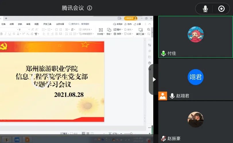 为深入贯彻落实党建引领作用,充分发挥党员先锋作用,信息工程学院学生党支部于2021年8月28日下午13点召开线上专题学习会议,参加本次会议的有信息工程学院学生党支部书记付佳、副书记赵翊君,以及全体预备党员,会议由学生党支部副书记赵翊君主持。