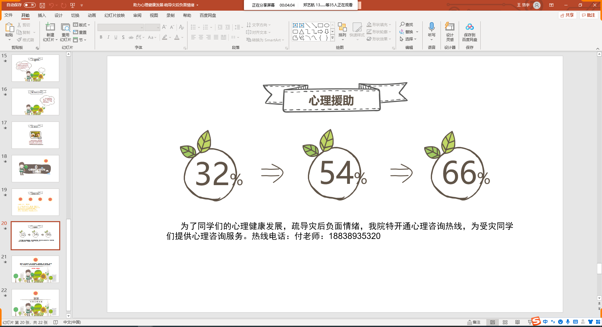 本次线上心理健康教育主题班会十分有意义,能够帮助同学们在灾难突发性事件发生后的短时间内,尽快地调整自己,积极地去处理自己的具体健康问题以及相关症状,采取积极的态度面对,使得焦虑情绪逐渐减轻、自信心增加、社会功能恢复。