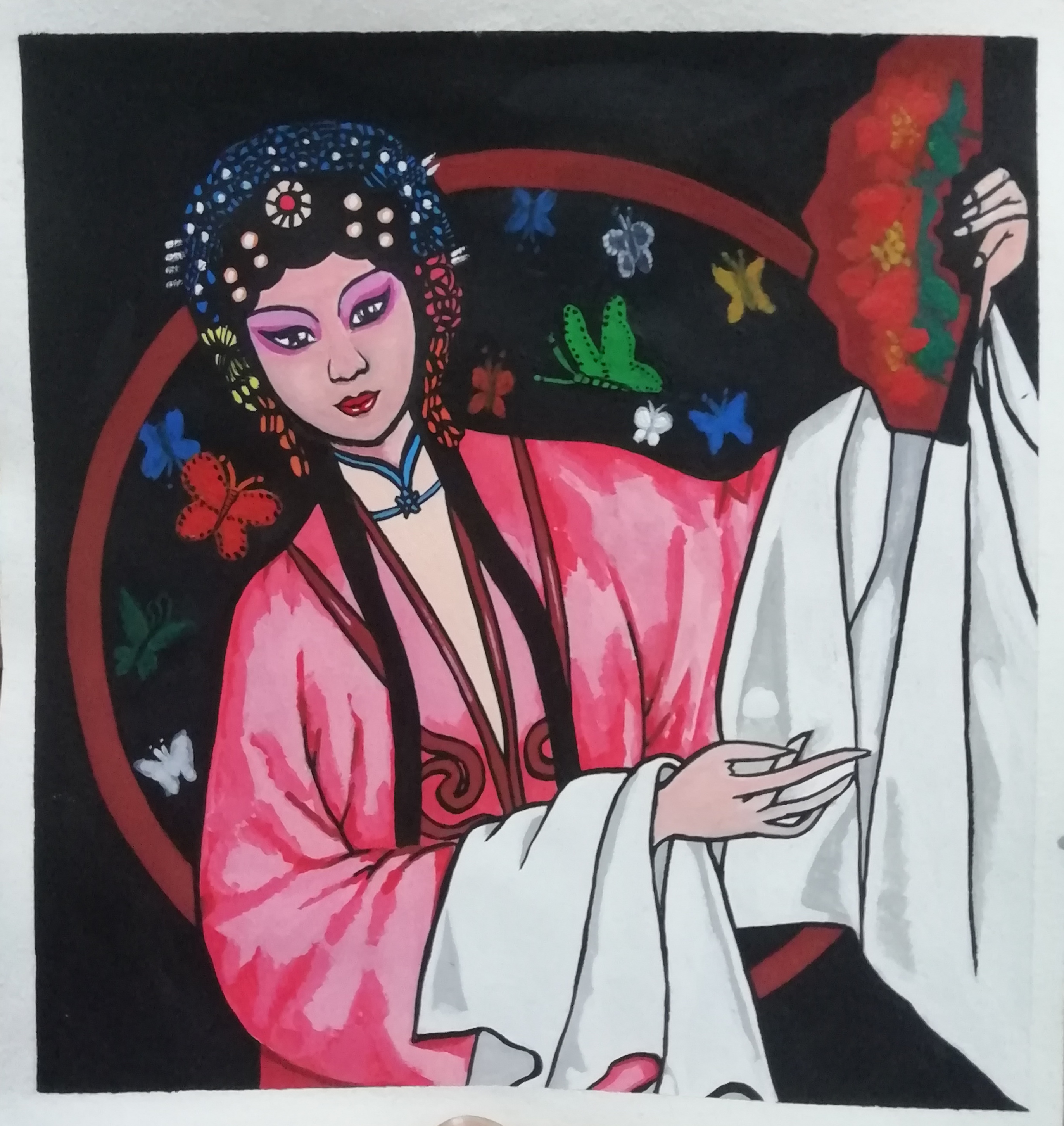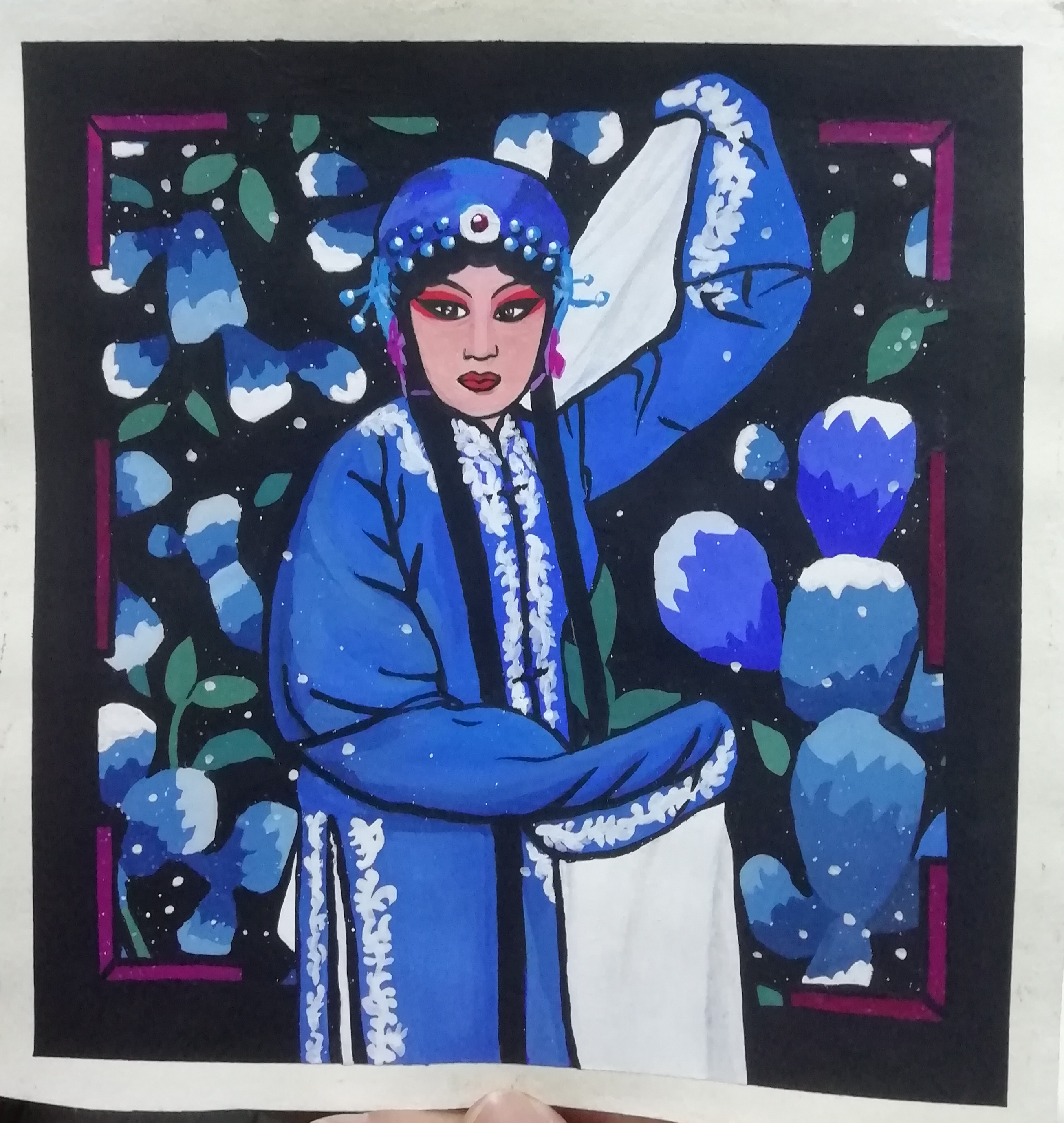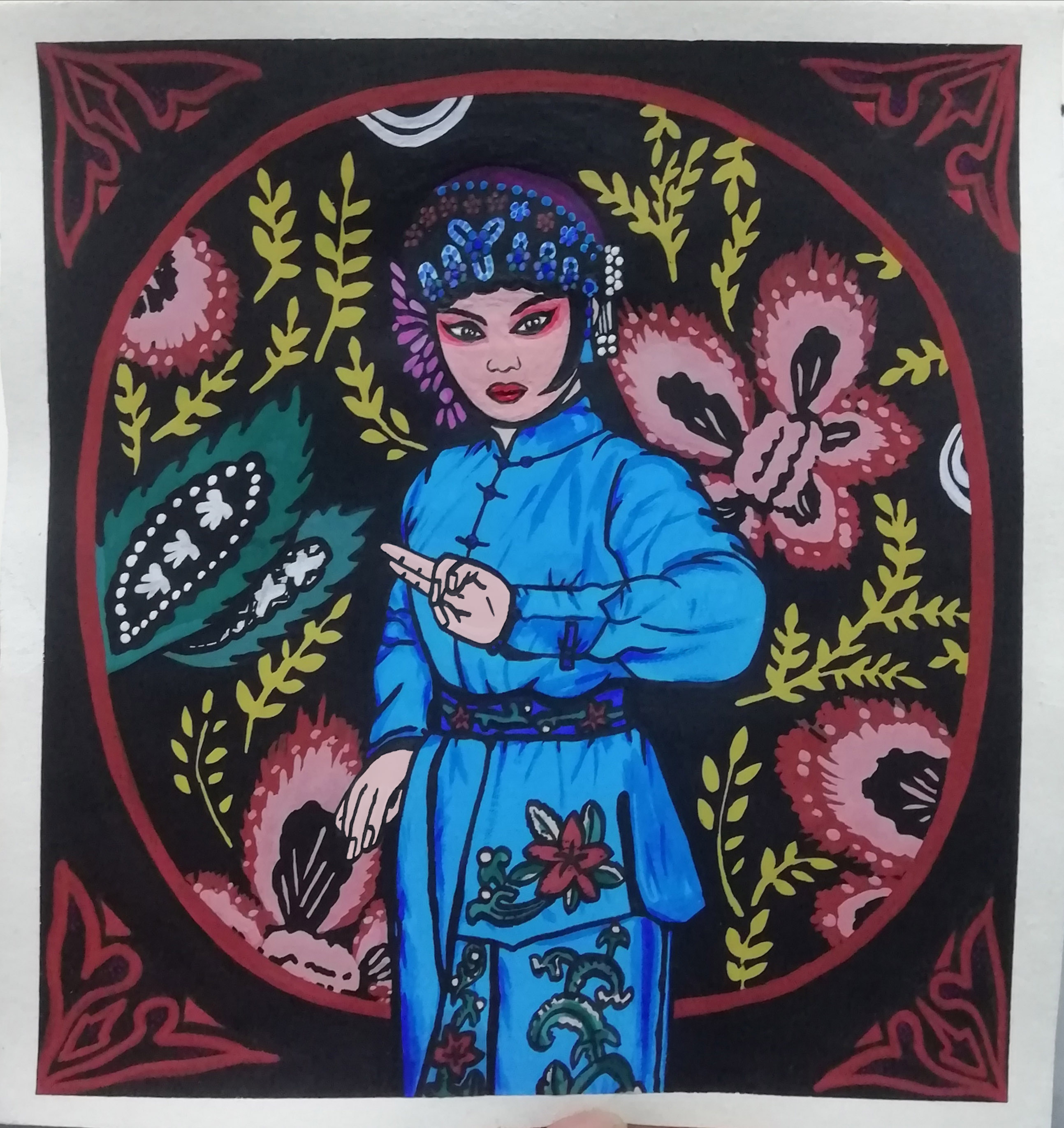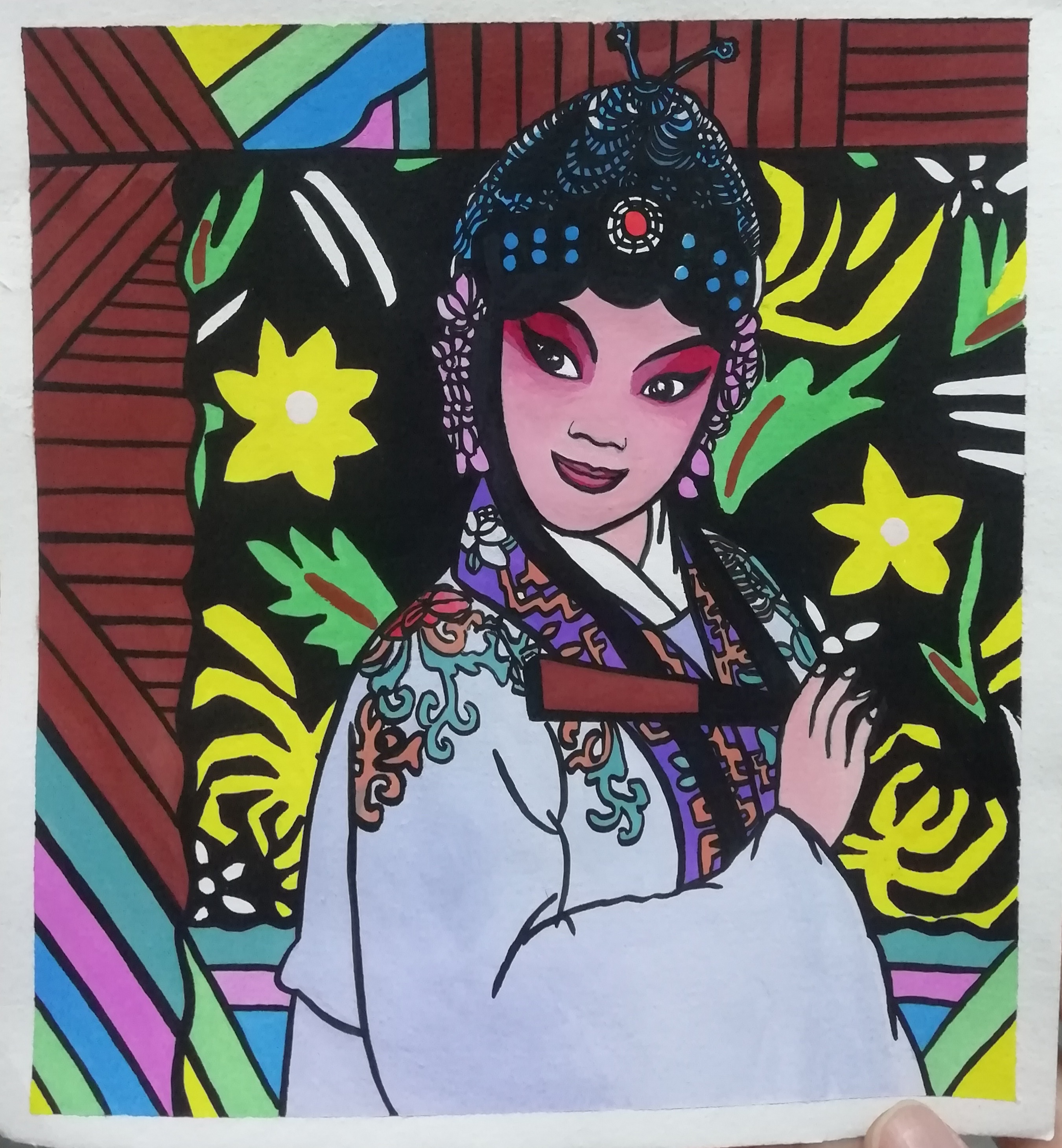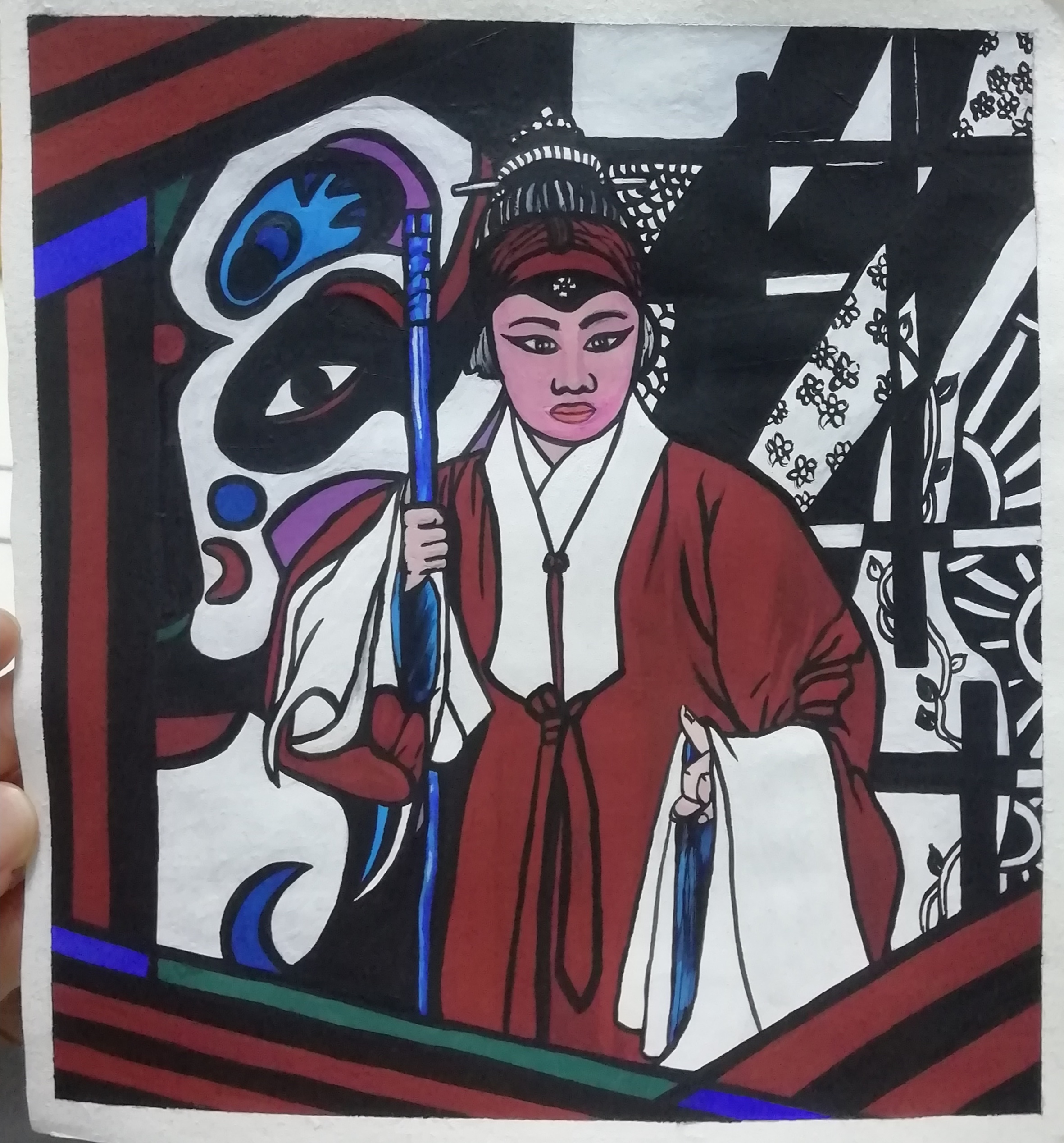 设计说明:《梨园春秋—旦角造型篇》的设计灵感来源于自己从小喜爱听戏,而且只喜欢特别感兴趣的片段、特别感兴趣的人物,幻想自己就是那戏曲中英姿飒爽的女将军。其实戏曲和生活是相关的,正所谓人生如戏,让我很好的从生活中取了很多素材,并进行稍微夸张的艺术加工,例如我作品中的人物和人物动作。因为不知道毕业后还会不会接触绘画,所以我希望将不同的类别的女角色集结在我的作品,从而绘制出优秀的作品。最终,梦想变为现实。我也希望通过我的作品以戏曲冰山一角让更多人了解戏曲艺术造型的魅力。艺术源于生活、而又高于生活、最后又回归生活,少许的写实结合稍微夸张的装饰画设计而最终完成的装饰画作品,装裱后适合于装饰各种场景,让人在生活点滴中感受戏曲的魅力。