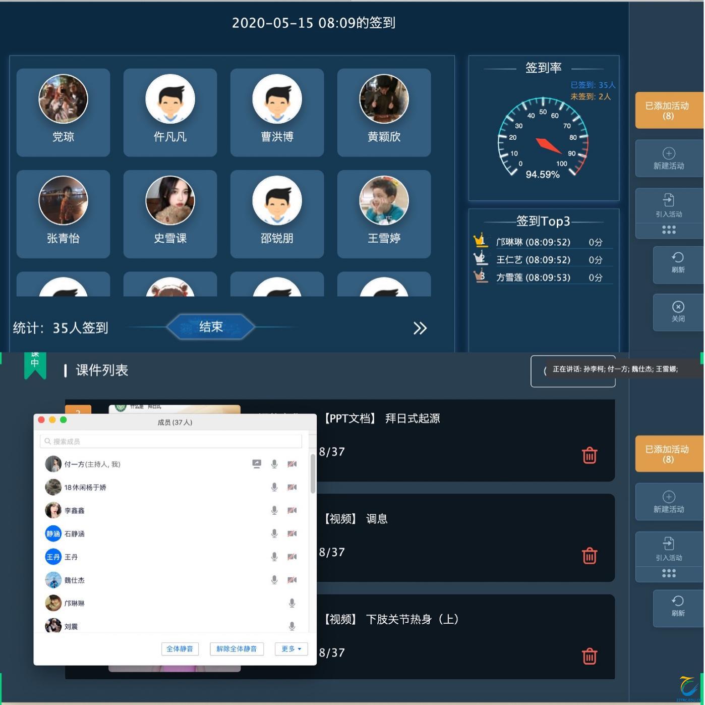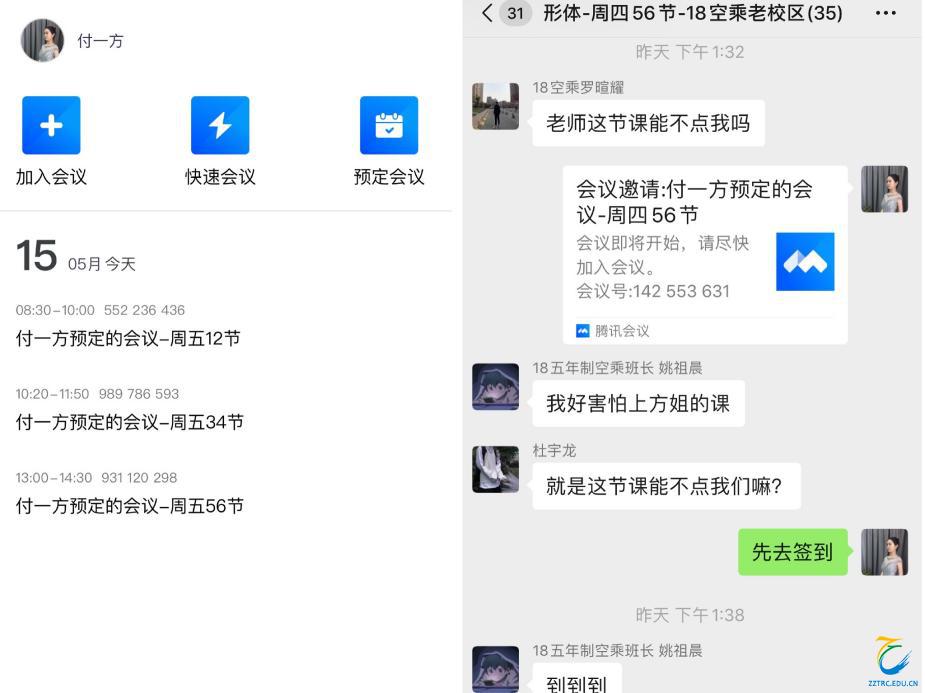 上课时间到,在“腾讯会议”中现场点名,保证签过到的学生都在会议室准备听讲。