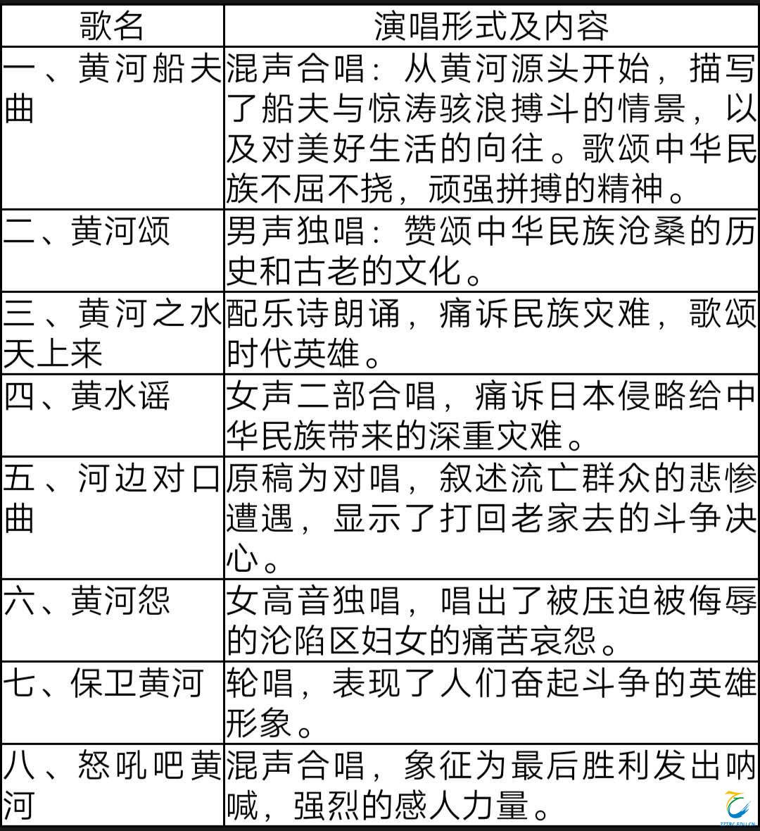 《黄河大合唱》是一部大型声乐套曲,诞生于抗日战争时期,光未然作词,冼星海作曲。共八个乐章,表现了中国人民的苦难与顽强斗争,也表现了我们民族的伟大精神和不可战胜的力量。它以我们民族的发源地——黄河为背景,展示了黄河岸边曾经发生过的事情,以激励人民起来反抗外来的侵略,保卫黄河、保卫华北、保卫全中国。作品气势宏伟磅礴,音调清新、朴实优美,具有鲜明的民族风格,强烈反映了时代精神。《黄河大合唱》在我国近代音乐史上具有重大的意义,对后来的大合唱及其他体裁的音乐创作都产生了巨大而深远的影响。