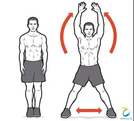2.用力向上跳起,同时双脚向两侧张开。手掌心在起始时朝下,在跳跃向上的过程中转向掌心朝前;