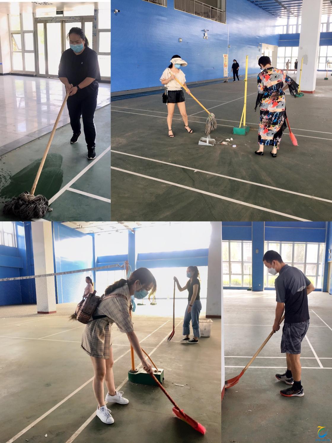 为做好开学前期的准备工作,本着“我劳动,我快乐,创造优美卫生环境就是助力防疫的心态”,8月27日,在薛月主任的带领下,体育教学部组织全体教师对体育馆和办公室进行了全方位、覆盖式、无死角的卫生大扫除。