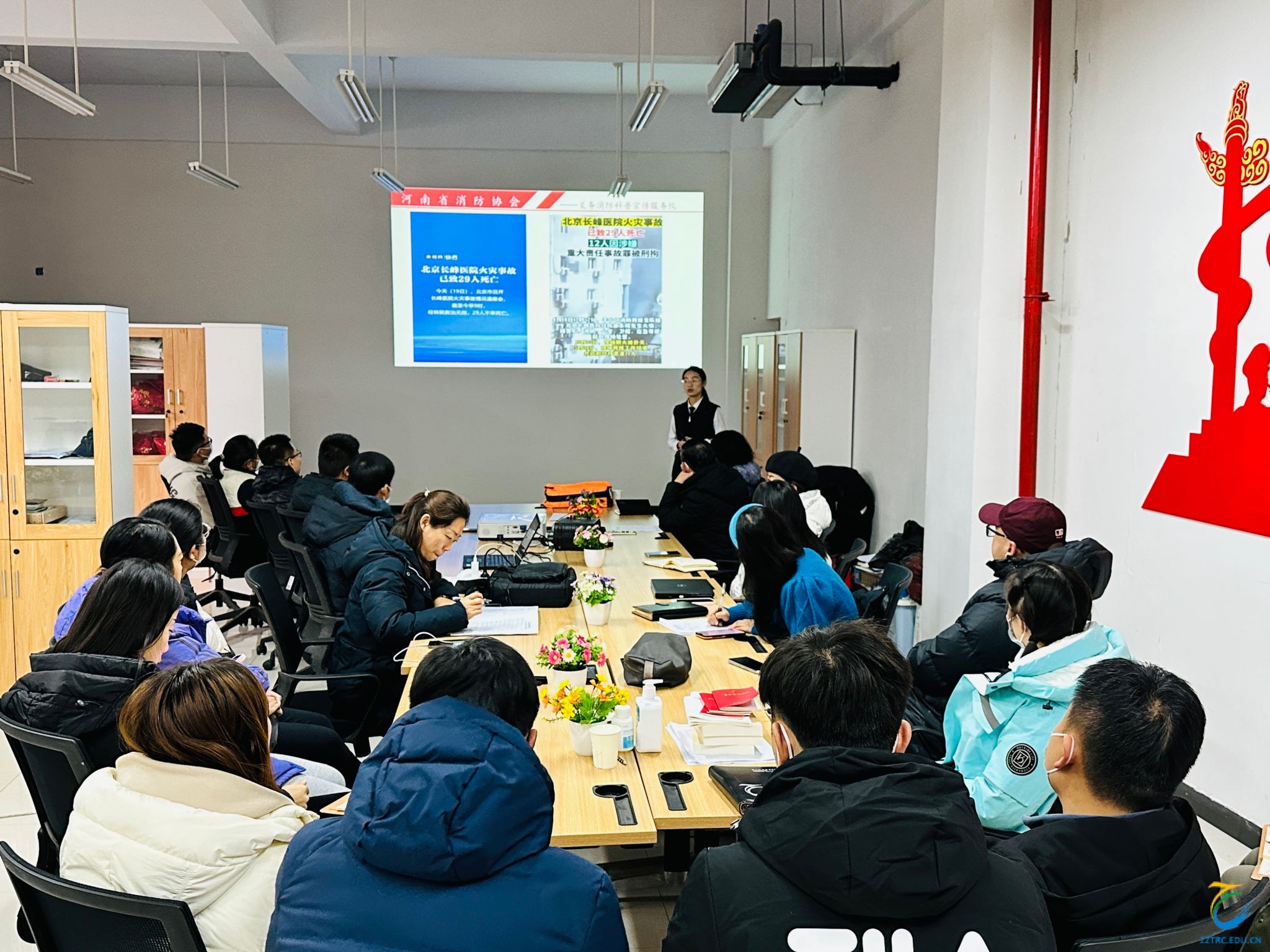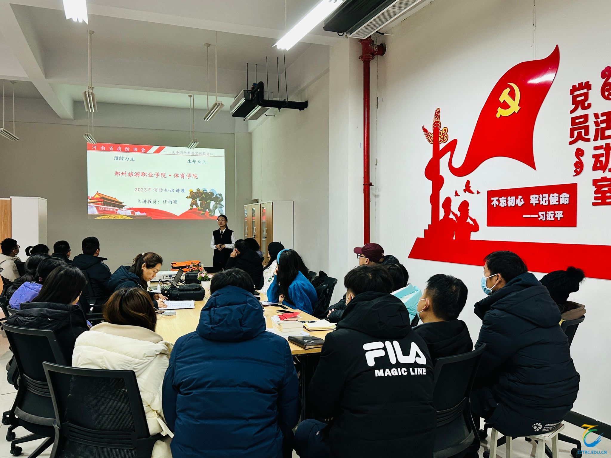 为响应2023年“预防为主,生命至上”的活动主题,为进一步落实学校有关安全稳定工作的要求,有效提升体育学院全体教师消防安全意识和自防自救能力,12月13日,体育学院特邀河南省消防协会任柯颖教员于综合楼A102对全体教师进行了消防安全培训。