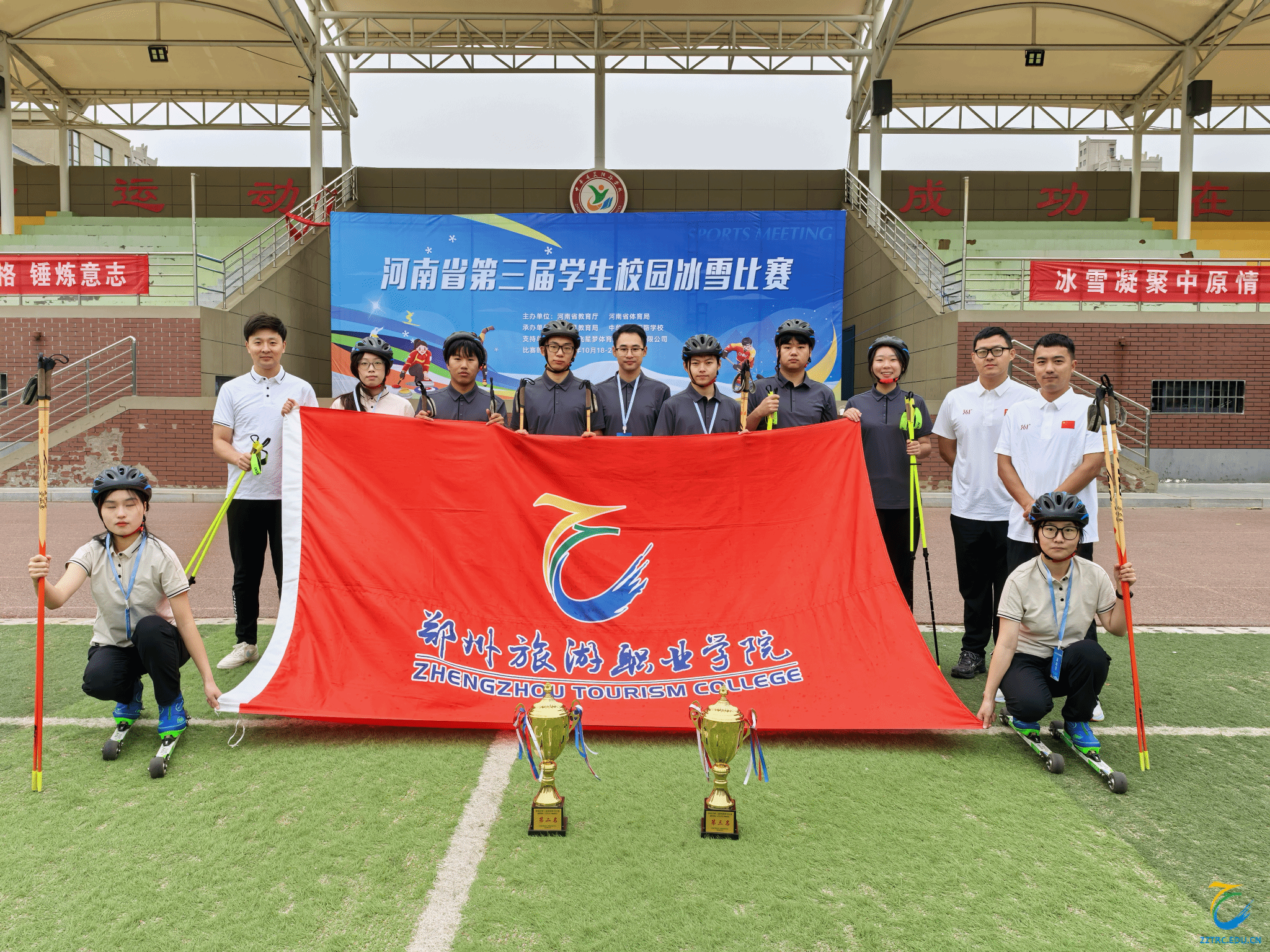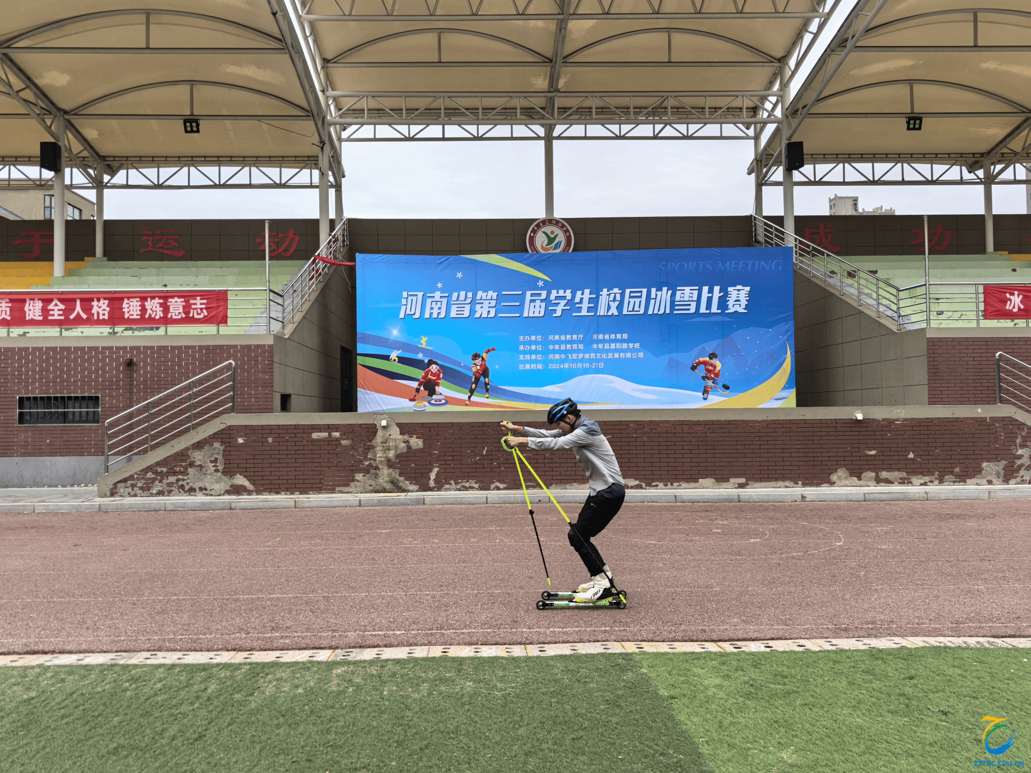 10月19日上午,由河南省教育厅、河南省体育局主办,中牟县教育局、中牟县晨阳路学校承办,河南省学生体育总会冰雪运动协会协办,河南中飞星梦体育文化发展有限公司执行的河南省第三届学生校园冰雪比赛于中牟县晨阳路学校隆重开幕。本次比赛为期4天,设有陆地冰壶、软式曲棍球(陆地滑雪)、越野滑轮(陆地滑雪)三个项目,有来自全省28所学校31支代表队参加小学组、特教组(听力组、培智组、混合组)、高校组(男、女)三大组别的比赛。