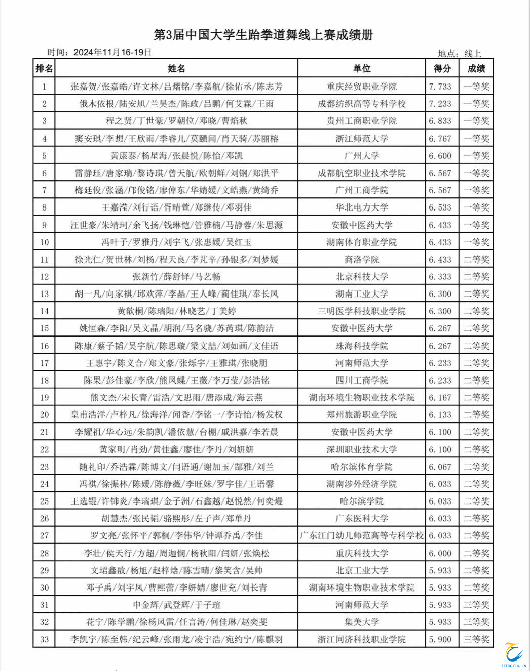 第三届中国大学生跆拳道舞线上赛于2024年11月16日至19日如期举行,本次大赛由中国学生体育联合会主办,中国学生体育联合会大学生跆拳道分会执行,吸引了来自中国人民大学、西安交通大学、厦门大学等全国近百所高校参加,值得一提的是本次大赛不区分项目和专业组别,本专科院校同场竞技,经过四天的激烈角逐,最终,pp电子跆拳道舞代表队荣获了全国二等奖的好成绩。