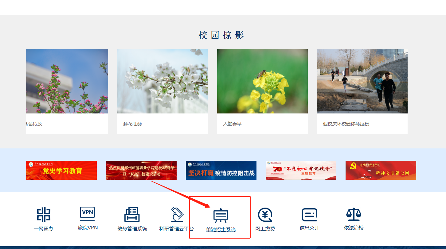 1.登录系统。请各位考生4月15日-16日使用电脑通过pp电子官网首页下方的“单独招生系统”链接或直接点击网址http://zldz.zztrc.edu.cn/进入“单独招生系统”。