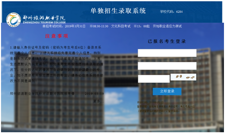 请各位考生28日登陆我院官网http:/首页,点击单独招生录取系统,输入身份证号及密码(密码为考生号后6位)登录本系统完善个人信息并打印准考证。也可直接登陆我院单招招生录取系统http://zldz.zztrc.edu.cn/完善相关信息。