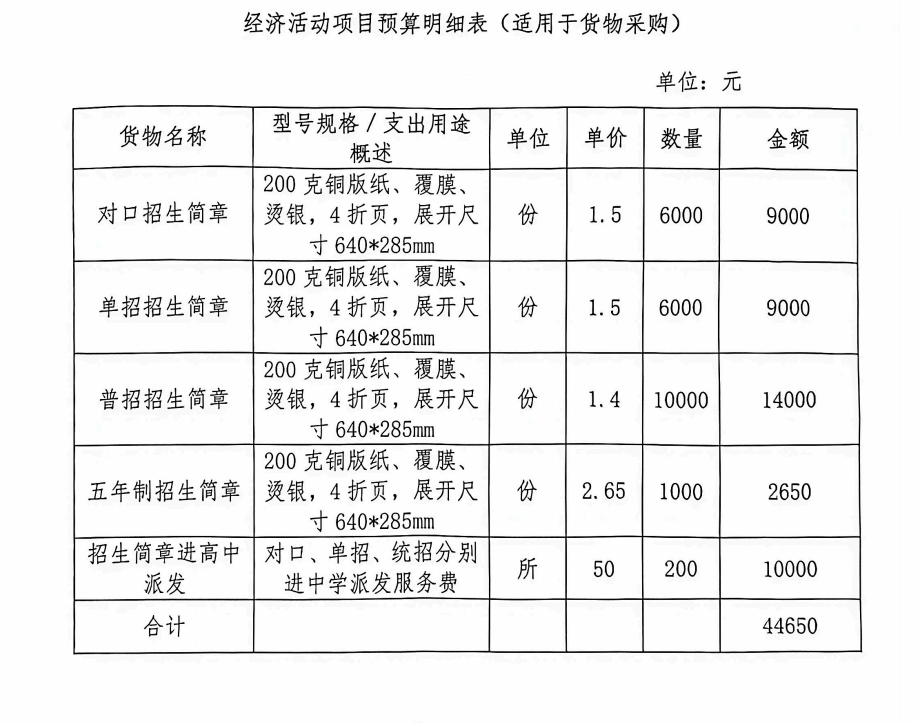 负责设计并印刷学校对口、单招、普招及专科一体培养(原五年制)的招生简章,制作数量及要求见“经济活动项目预算明细表”。