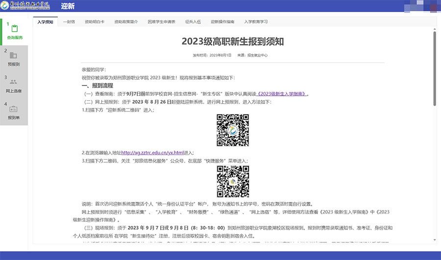 通过电脑或移动设备均可登录迎新系统,迎新系统为每届新生提供相关服务,包括查询服务、网上预报到、网上选宿等功能。