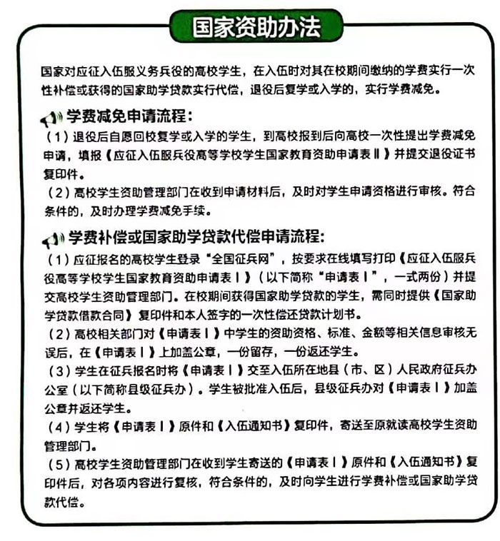 3.国家资助学费:国家对应征入伍服义务兵役高校学生,在入伍时对其在校期间缴纳的学费实行一次性补偿或用于学费的国家助学贷款实行代偿;对应征入伍服义务兵役前正在高等学校就读的学生(含按国家招生规定录取的高校新生),退役后自愿复学或入学的,实行学费减免。学费补偿、国家助学贷款代偿以及学费减免的标准,本专科生每生毎年最高不超过12000元,研究生每生毎年最高不超过16000元。