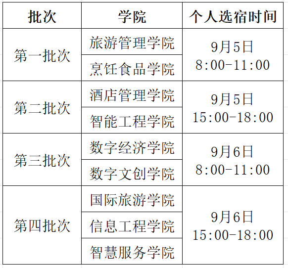 1.个人选宿:9月5-6日上午8:00-11:00;下午15:00-18:00分四批开放网上个人选宿功能;9月3日12:00前完成网上交费的新生可参与网上个人选宿。