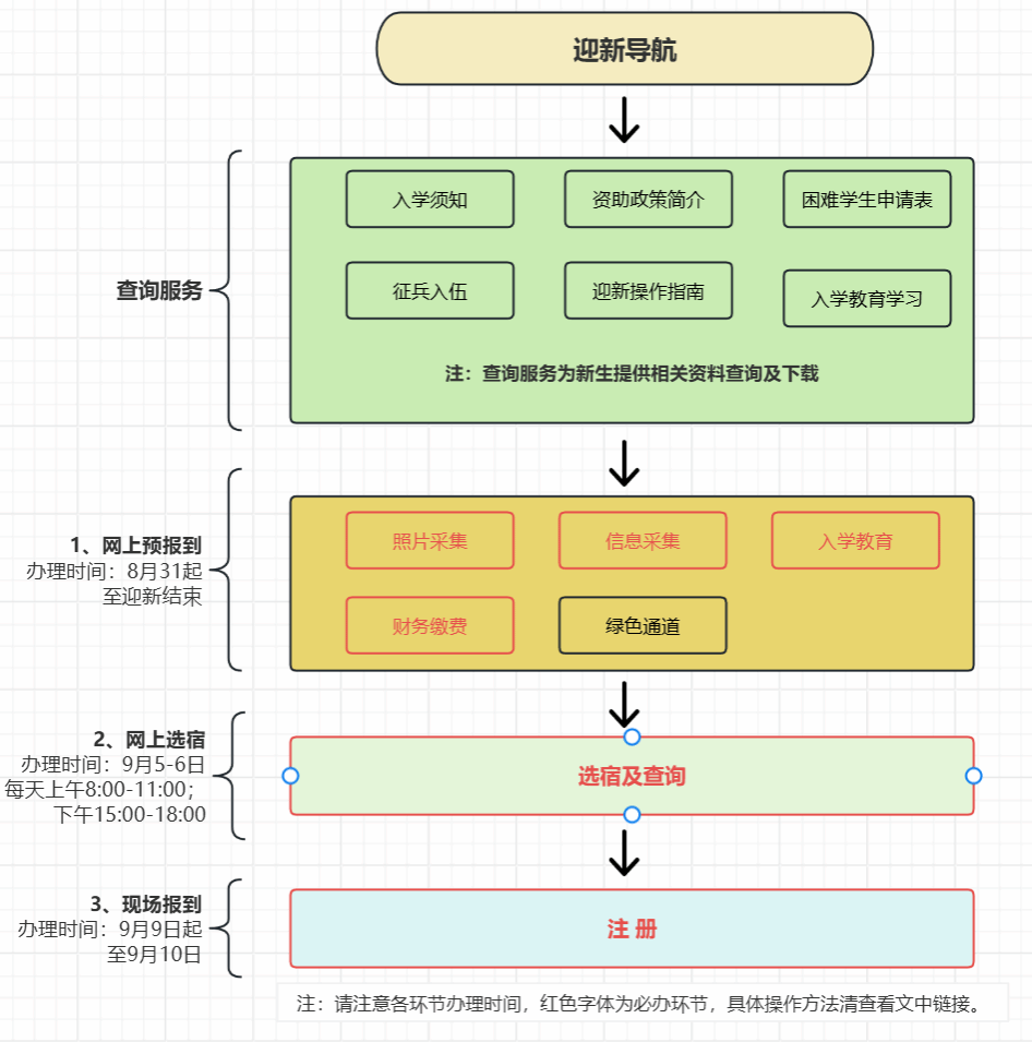 3.现场分宿:未进行个人选宿、系统分宿的新生在现场报到当天进行现场分配宿舍。