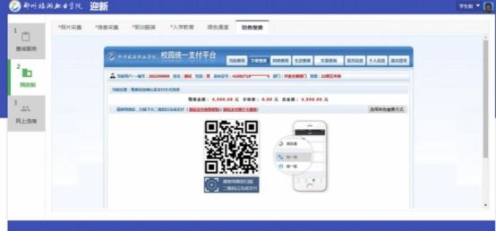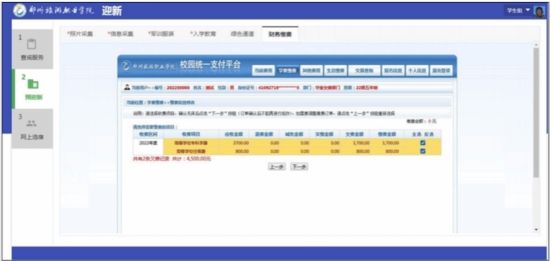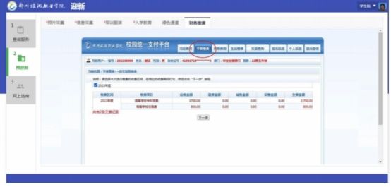 该环节与学校统一支付平台联动,点击后自动打开支付平台,点击【学费缴费】,显示个人2024年度应交款明细表,点击【下一步】按钮,按照说明依次点击【下一步】按钮。