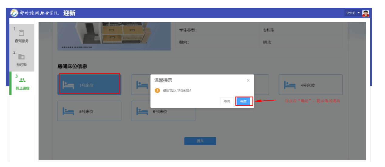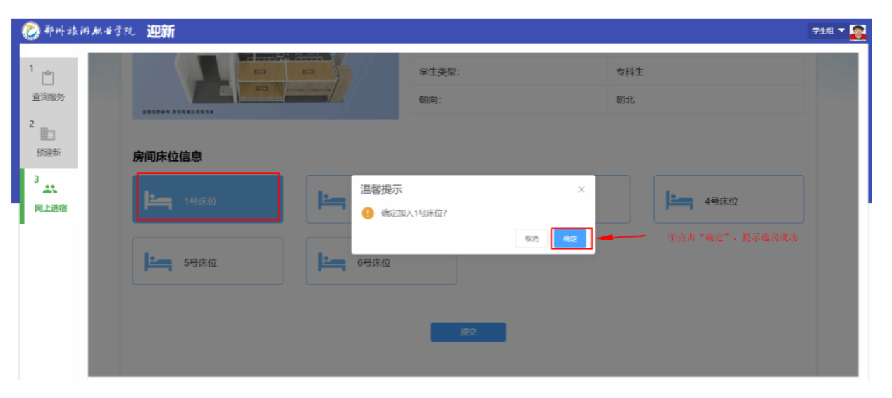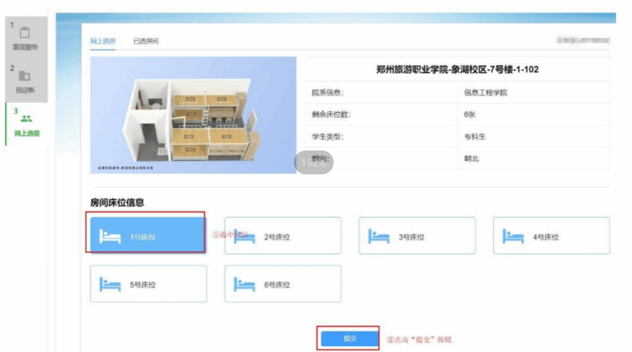 点击“房间”图标,显示该房间的参考示意图、简要信息及可选床位信息。单机选择意向床位图标,如“1号床位”,选中床位按钮则会突出显示,点击“提交”按钮,再次确认所选床位,单击“确定”后则选房成功。