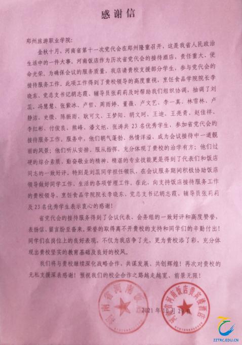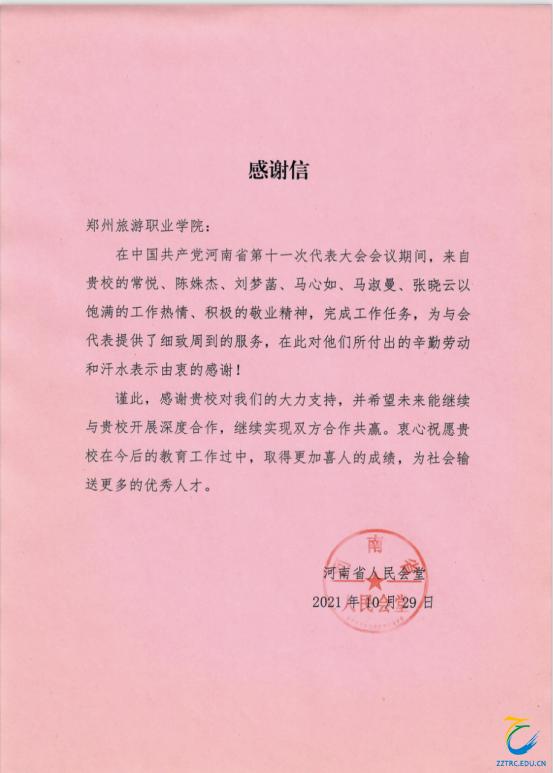 10月26日至29日,中国共产党河南省第十一次代表大会在郑州成功举行。为配合做好大会接待工作,pp电子烹饪食品学院先后选派29名志愿者,分三批前往河南饭店、河南少人民会堂提供志愿服务,受到了与会代表和接待单位的好评与表扬。
